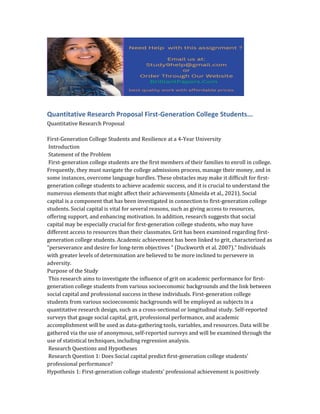 This quantitative study aims to examine how social capital and grit influence academic and professional success among first-generation college students from various socioeconomic backgrounds. Self-reported surveys will be used to collect data on social capital, grit, academic performance, and professional achievement from a sample of first-generation college students. Regression analysis will then analyze the relationships between these variables and determine whether social capital predicts professional performance or grit predicts academic performance differently for students from lower-resourced backgrounds. The findings could help universities better support first-generation students.