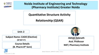 The document serves as a teaching resource for a course on quantitative structure-activity relationships (QSAR) in drug discovery, covering the history, principles, and methodologies involved. It outlines the objectives, course outcomes, and prerequisites for students, as well as the applications of QSAR in developing new pharmaceuticals. Key topics include the differences between structure-activity relationships (SAR) and QSAR, various analytical methods, and the steps involved in QSAR modeling.