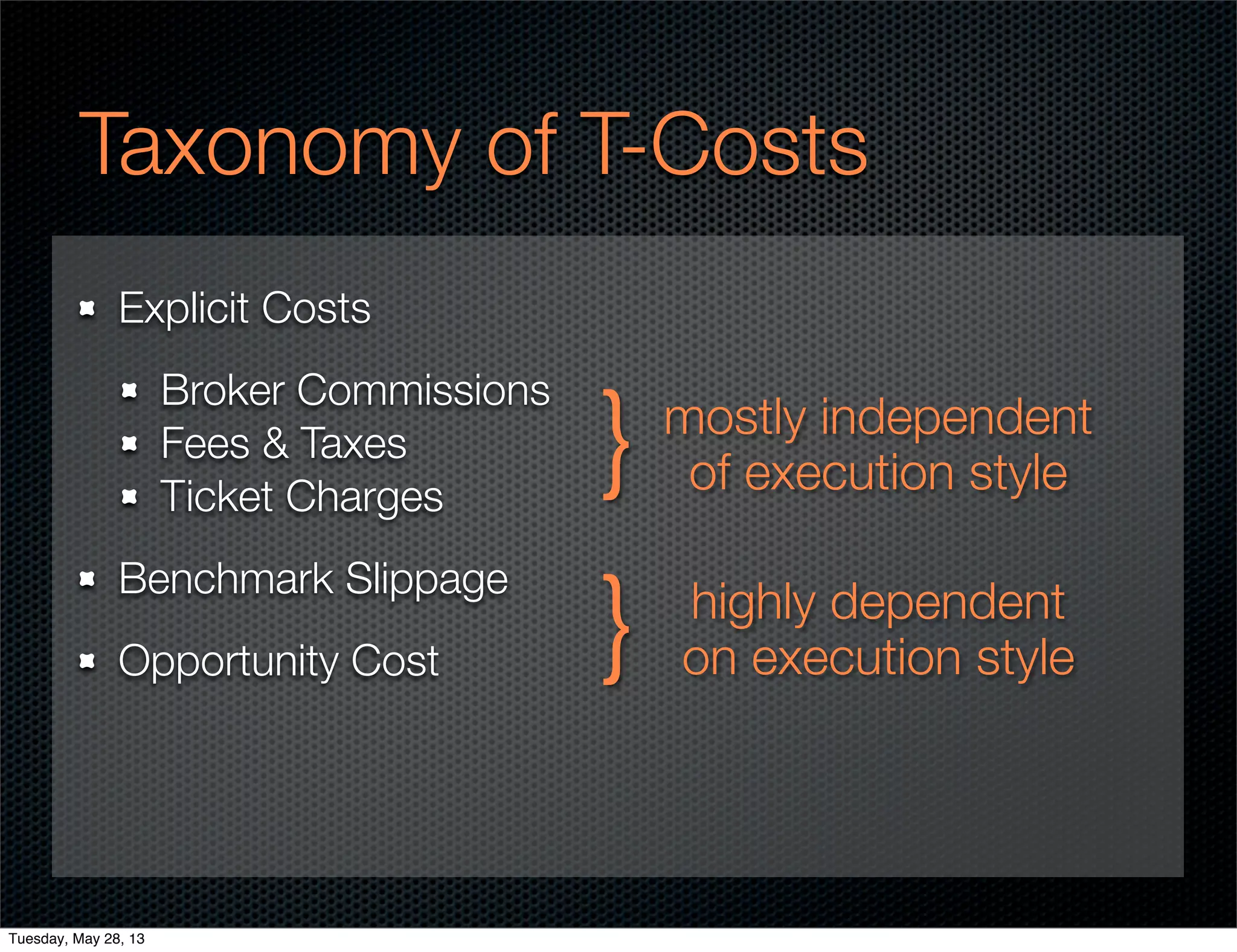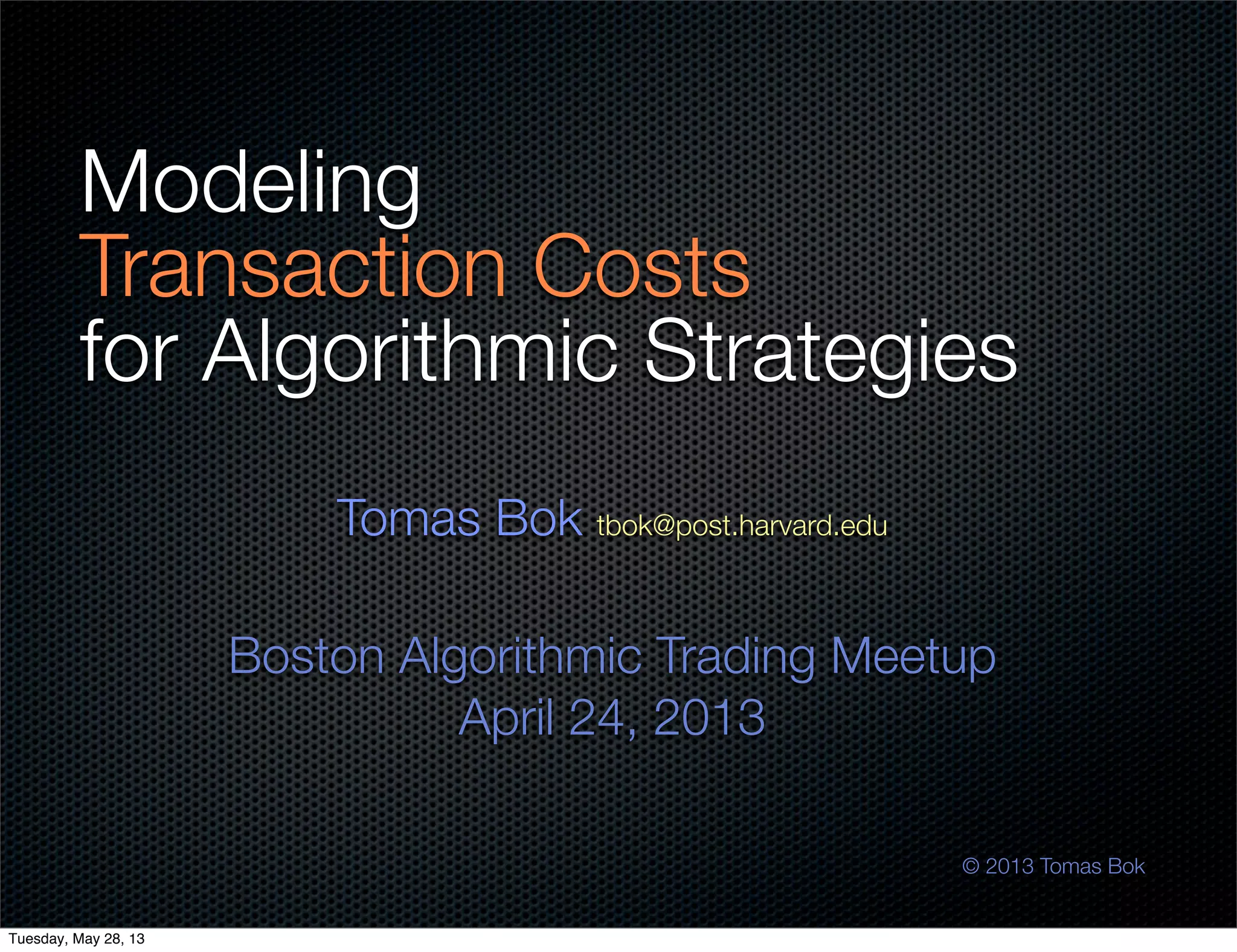 This document discusses modeling transaction costs for algorithmic trading strategies. It presents a taxonomy of explicit costs like commissions, fees, and taxes as well as opportunity costs and benchmark slippage. Two methods are described for estimating slippage: equation-based models and simulating child order fills. The appropriate method depends on the strategy's timescale. The document provides guidelines for keeping transaction cost modeling simple while still accounting for costs accurately. It emphasizes considering costs early in the strategy development process.