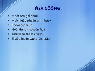Tài liệu trình bày về quản trị bán hàng và các phương pháp quản lý hiệu quả trong lĩnh vực này, bao gồm việc thiết lập tổ chức bán hàng, lập kế hoạch và đánh giá doanh số. Nó nhấn mạnh tầm quan trọng của việc chia sẻ kinh nghiệm và khuyến khích thảo luận để nâng cao hiệu suất bán hàng. Học viên sẽ hiểu rõ vai trò và nhiệm vụ của từng vị trí trong bộ phận bán hàng cũng như cách thức tối ưu hóa quy trình làm việc.
