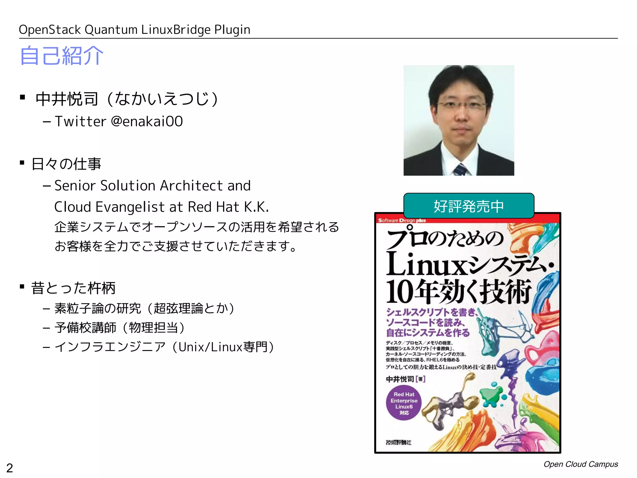 インタークラウドを実現する技術 〜 デファクトスタンダードからの視点 〜 OpenStackのQuantum(LinuxBridge Plugin)が実際どうやって仮想ネットワークを構成するのか説明する資料