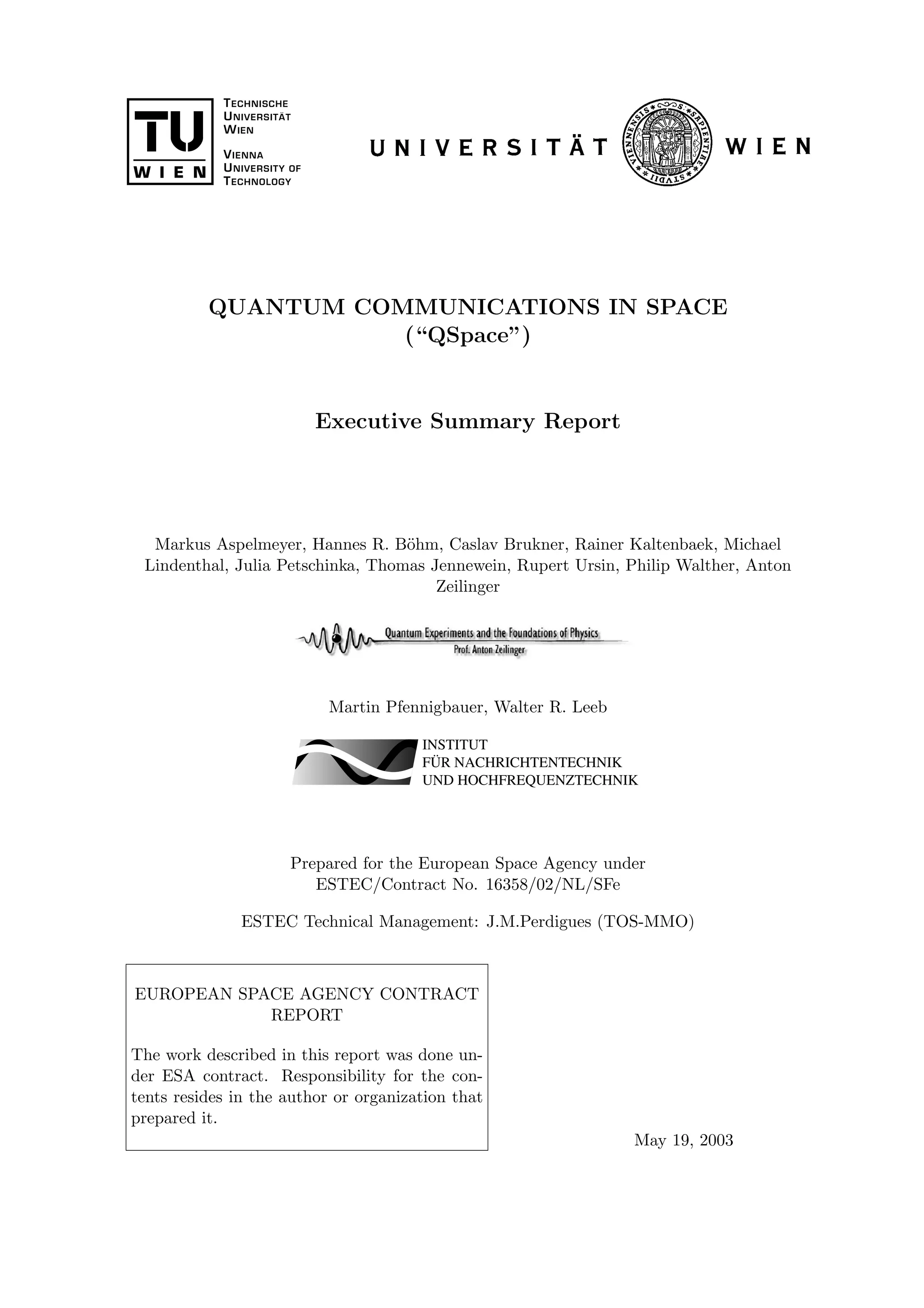 The document provides an executive summary of a study on the feasibility of adopting concepts from quantum physics and quantum communications to a space infrastructure. It discusses key principles like superposition, qubits, and entanglement. It compares quantum and classical optical communications, highlighting increased capacity and perfect security from quantum cryptography. It proposes a series of photon-based experiments using the International Space Station to demonstrate fundamental quantum physics and quantum key distribution. The experiments would start simply and increase in complexity, providing a logical progression to validate the technology.