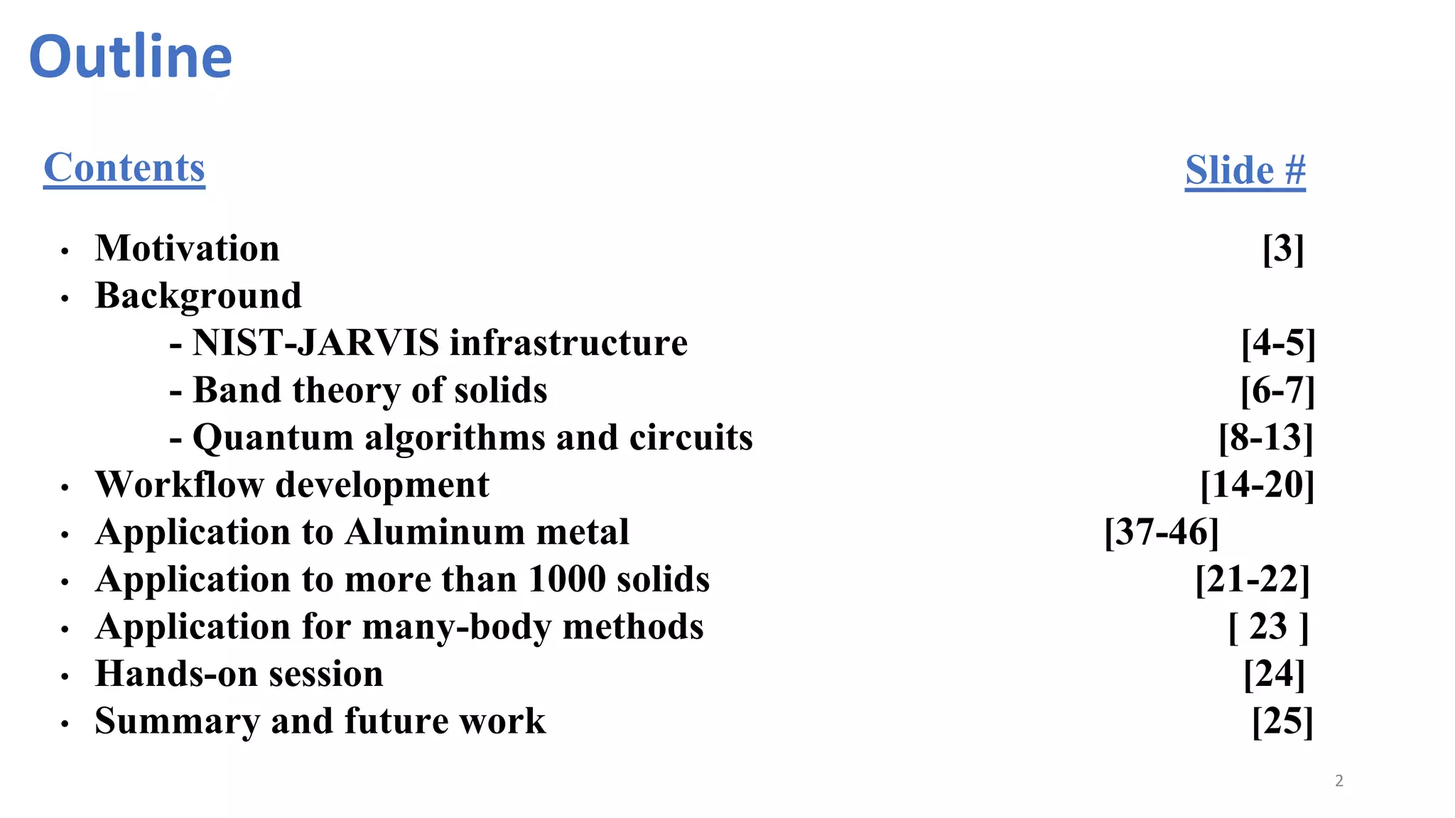 This document outlines a workflow for using quantum computing to simulate electron and phonon properties of solids. It discusses the motivation for using quantum bits to simulate quantum systems more easily. It provides background on band theory of solids, quantum algorithms like VQE and circuit models. The workflow is then applied to calculate properties of aluminum metal and over 1000 other materials using classical and quantum solvers. Future opportunities and challenges are also discussed.