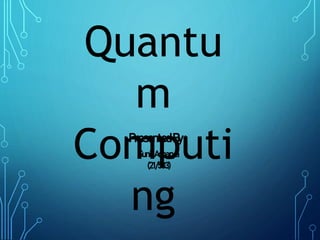 The document discusses quantum computing, detailing its history, fundamental principles, and unique features such as superposition, entanglement, and decoherence. It outlines the advantages of quantum computers, including faster computations and their effectiveness for simulations and medical applications, while also noting challenges like the need for very low operating temperatures and high error rates. Conclusion emphasizes the transformative potential of quantum computing and the ongoing efforts by companies like Google, IBM, and Microsoft to develop this technology further.
