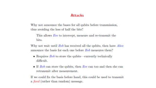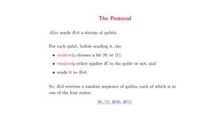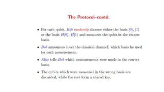 Presents an overview of quantum computing including its history, key concepts like qubits and superposition, applications like factoring large numbers and solving optimization problems, and advantages like speed and security compared to classical computers. Some challenges to building quantum computers are maintaining stability due to sensitivity to interference and requiring very cold temperatures.