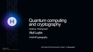 The document discusses the implications of quantum computing on cryptography, emphasizing the weaknesses of public-key cryptography against quantum attacks, while secret-key cryptography may remain secure with larger key sizes. It outlines the current capabilities and limitations of quantum computers, highlighting the need for post-quantum cryptographic solutions and the importance of remaining agile in cryptographic practices. The presentation stresses the urgency of addressing vulnerabilities while awaiting standardization of new algorithms.