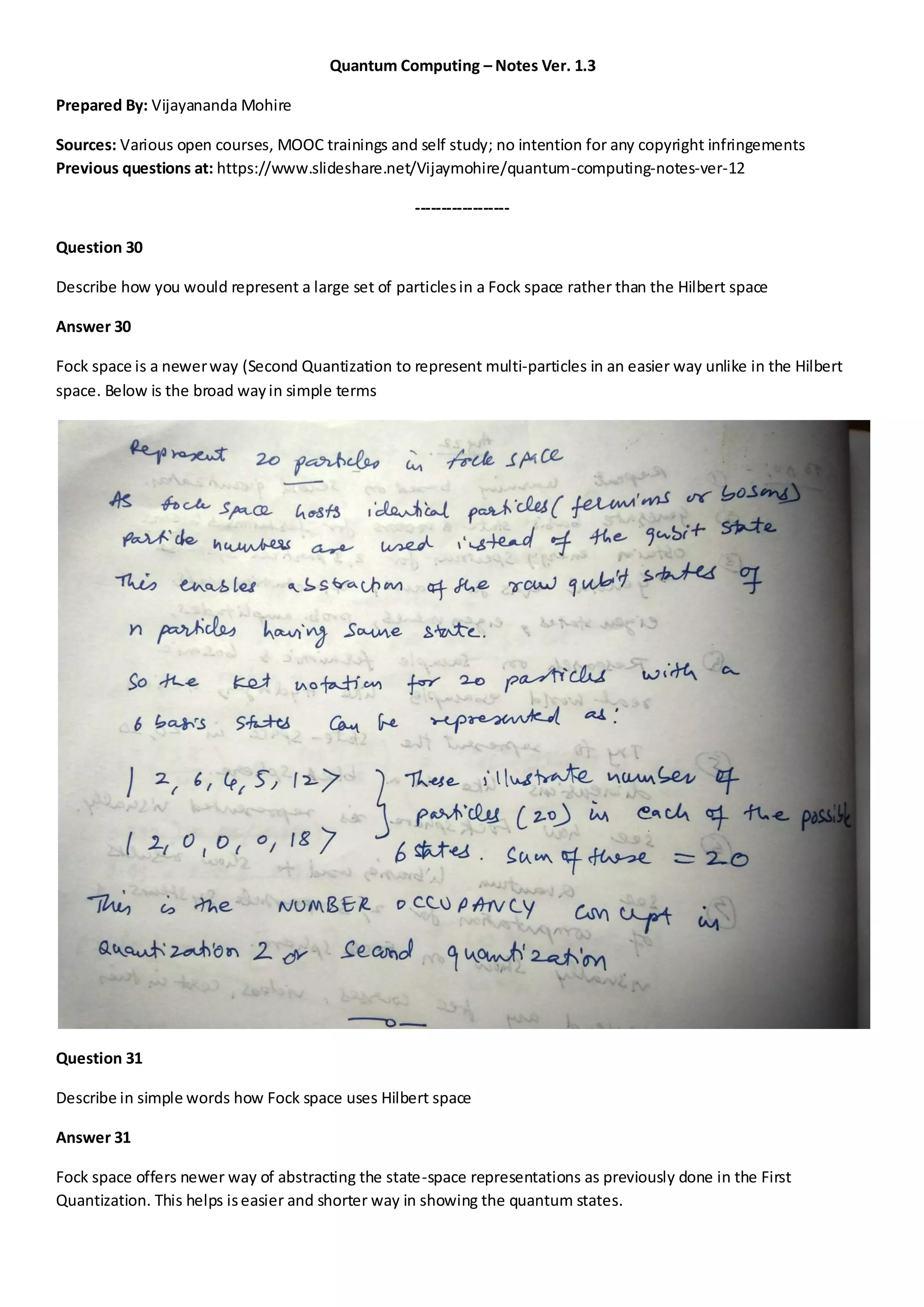 The document is a set of notes on quantum computing, focusing on the representation of particles in Fock space versus Hilbert space. It explains concepts like second quantization, state-space representations, and Wicks method in a simplified manner. The notes compile information from various open courses and provide references for further study.