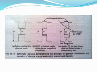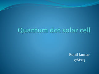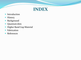 The document discusses quantum dot solar cells (QDSCs). QDSCs use quantum dots as the light-absorbing material instead of bulk semiconductors like silicon. Quantum dots have tunable bandgaps based on their size, allowing different energy levels to be harvested from the solar spectrum. This could enable higher efficiency multi-junction solar cells. The document outlines the history of QDSCs, describes how quantum dots exhibit quantum confinement effects, and discusses methods for fabricating quantum dots with different bandgaps through controlling their size and composition.