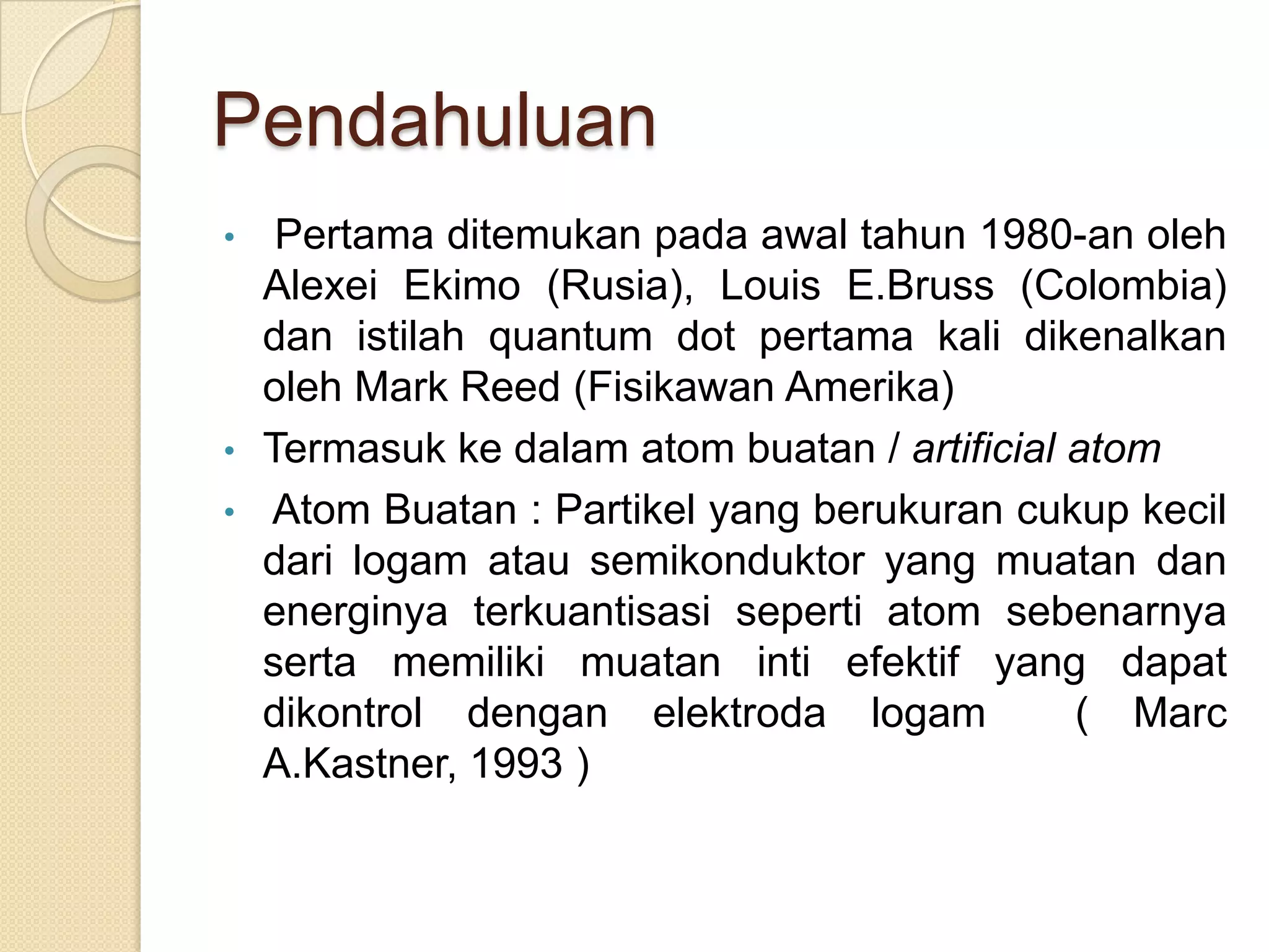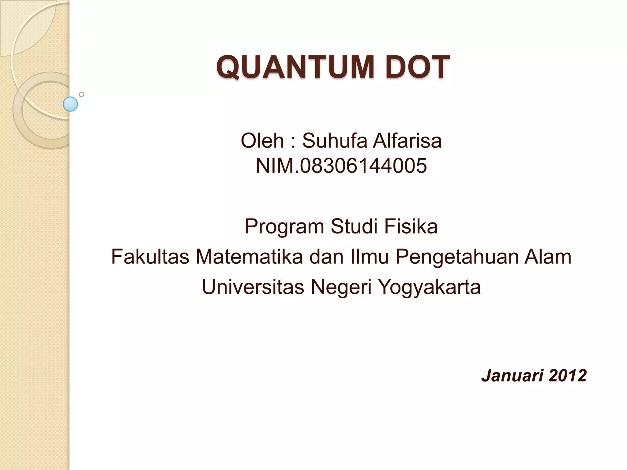 Dokumen tersebut membahas tentang quantum dot, yaitu partikel semikonduktor nano berukuran yang dapat mengurung elektron secara tiga dimensi sehingga energinya menjadi terkuantisasi. Quantum dot dapat dibuat dengan mengurung elektron di antara dua lapisan isolator di dalam semikonduktor. Sifat kuantumnya memungkinkan aplikasi pada alat optik, bioteknologi, komunikasi, dan detektor sensitif.
