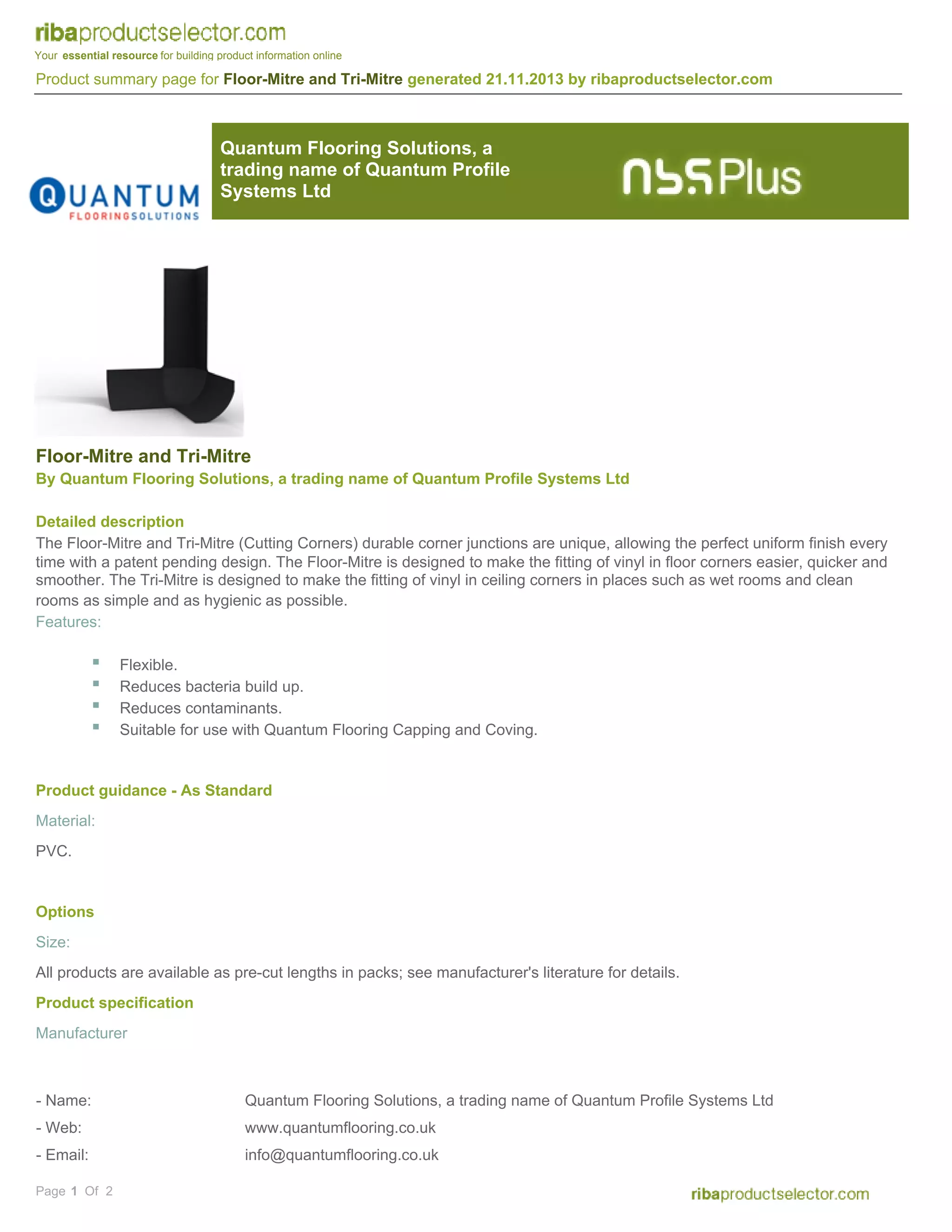 The Floor-Mitre and Tri-Mitre are durable corner junctions designed by Quantum Flooring Solutions to provide a perfect, uniform finish when fitting vinyl flooring and ceilings. The Floor-Mitre is for floor corners and makes installation easier, quicker and smoother, while the Tri-Mitre is for ceiling corners like in wet rooms and reduces bacteria buildup. Both products are flexible, reduce contaminants, and are suitable for use with Quantum Flooring capping and coving. They are made of PVC and available in pre-cut lengths.