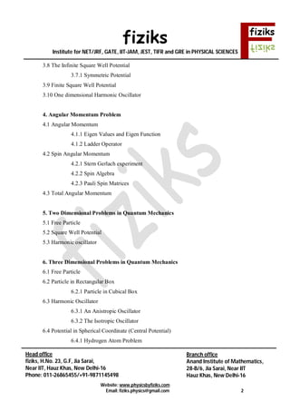 This document contains a quantum mechanics formula sheet from fiziks, an institute that provides coaching for physics exams. It covers various topics in quantum mechanics over 12 sections, including wave-particle duality, mathematical tools, the Schrodinger equation, angular momentum, perturbation theory, and identical particles. It also provides contact information for fiziks' head office and branch office in New Delhi, India.