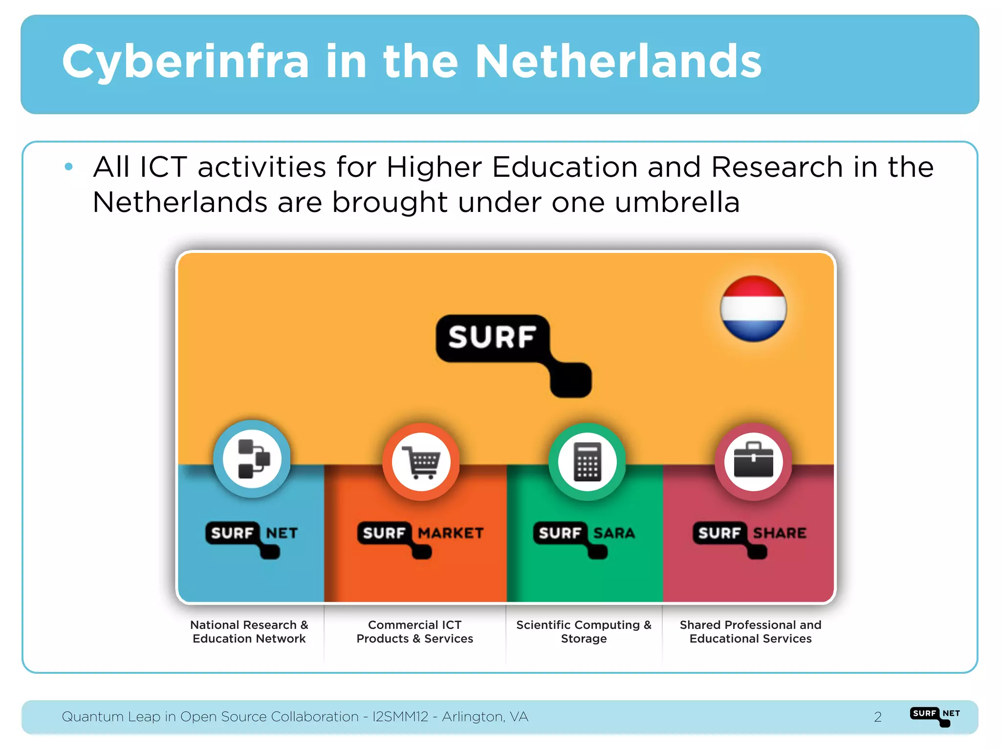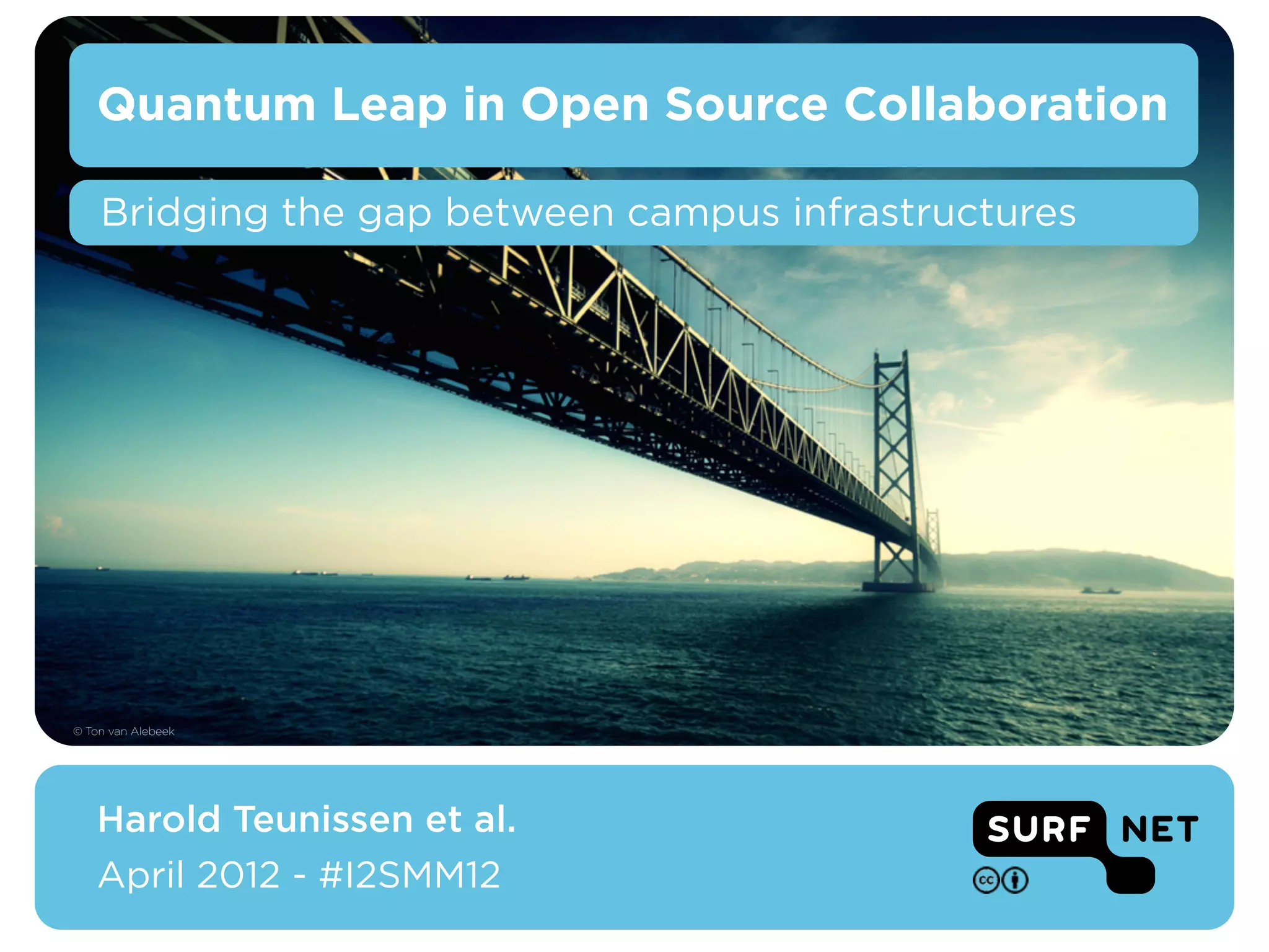 This document discusses open source collaboration and quantum leaps in research infrastructure. It describes how a national research and education network in the Netherlands brings together campus infrastructures to support large-scale, collaborative research projects requiring high-bandwidth networks and shared resources. Examples of multi-disciplinary projects are provided, and it outlines how open source tools can provide identity management, groups management, and other services to enable virtual collaboration across domains.