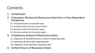 1. The document discusses quantum mechanical resonance states from both a time-dependent and stationary perspective.