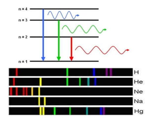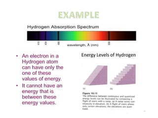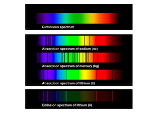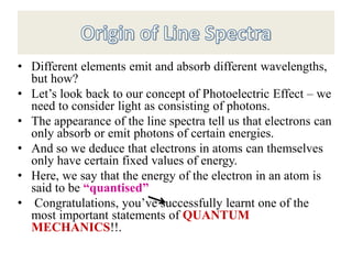 The document discusses the dual nature of light and particles, specifically photons, and the principles of wave-particle duality in physics, emphasizing phenomena such as the photoelectric effect and electron diffraction. It illustrates how light behaves as both a wave and a particle, with explanations supported by historical experiments and theories from physicists like Einstein and de Broglie. Key concepts include energy transfer through waves, the emission and absorption line spectra, and the importance of threshold frequency in photon energy release.