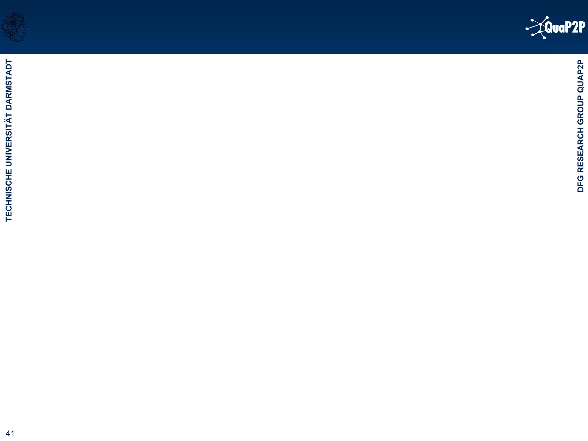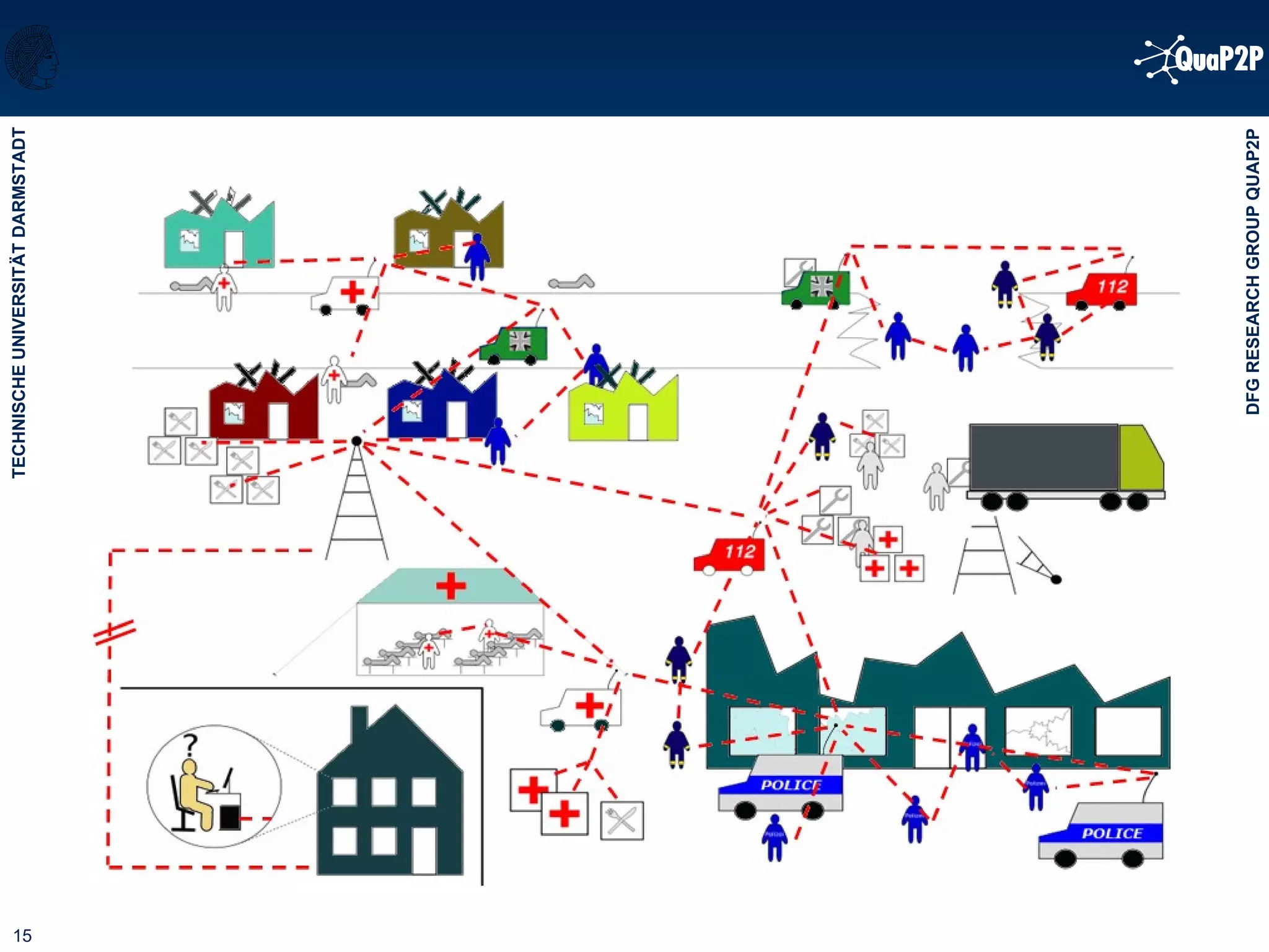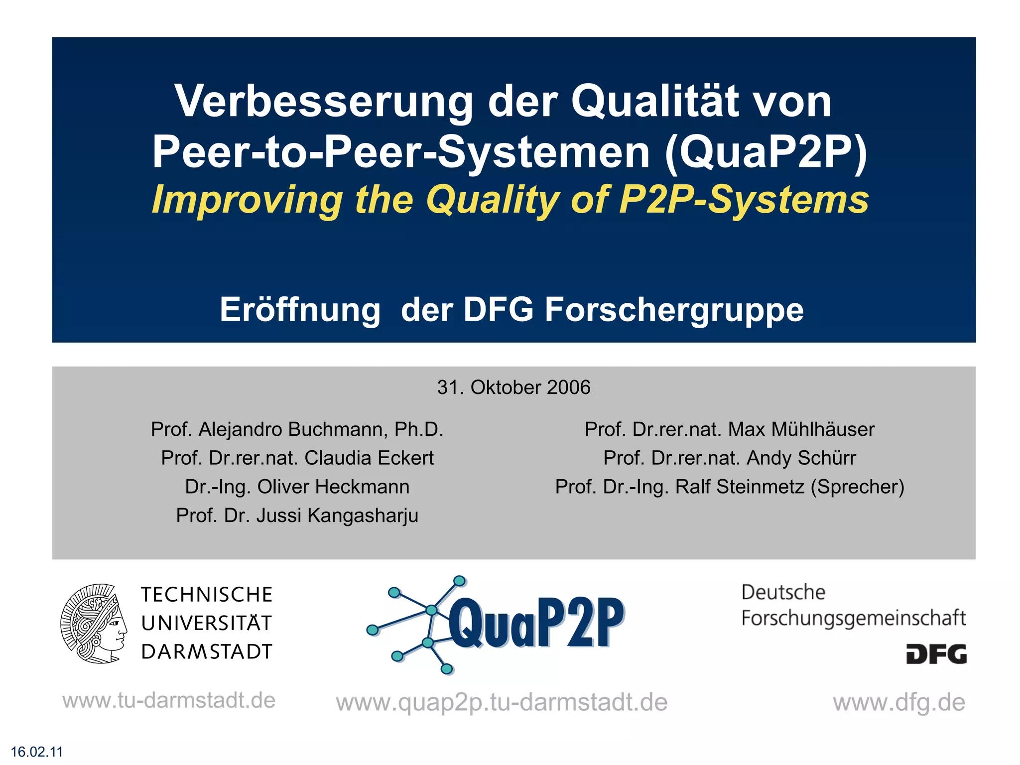 This document summarizes the agenda and goals of a research group meeting on improving the quality of peer-to-peer (P2P) systems. The agenda includes welcome addresses from various deans and professors, presentations on P2P applications and quality in P2P systems. The goals of the research group are introduced, including identifying quality attributes of P2P systems, examining relationships between attributes, and prototyping mechanisms using reference scenarios in disaster recovery communications and software development. Researchers are assigned topics related to performance, costs, security, and other quality attributes.