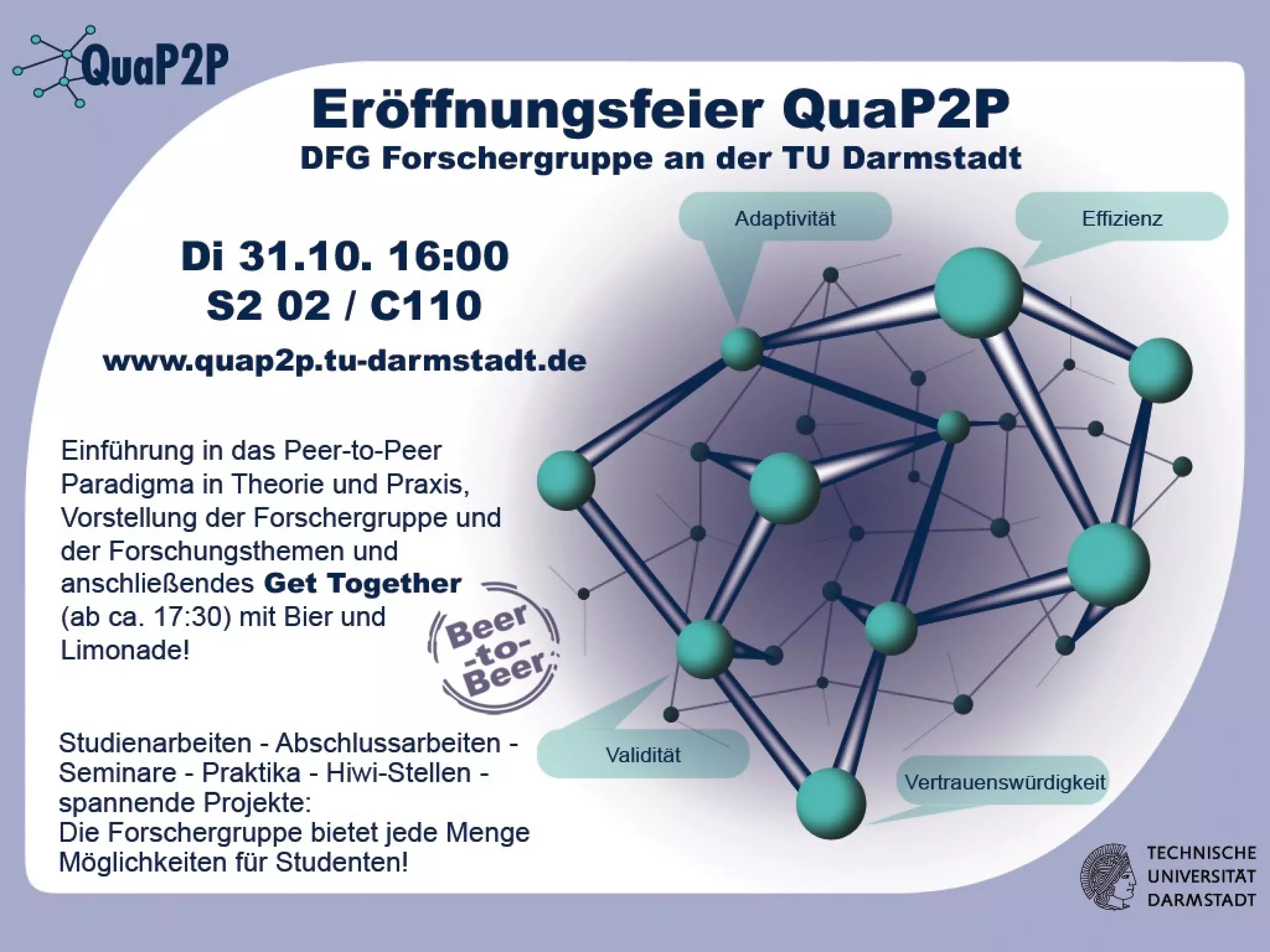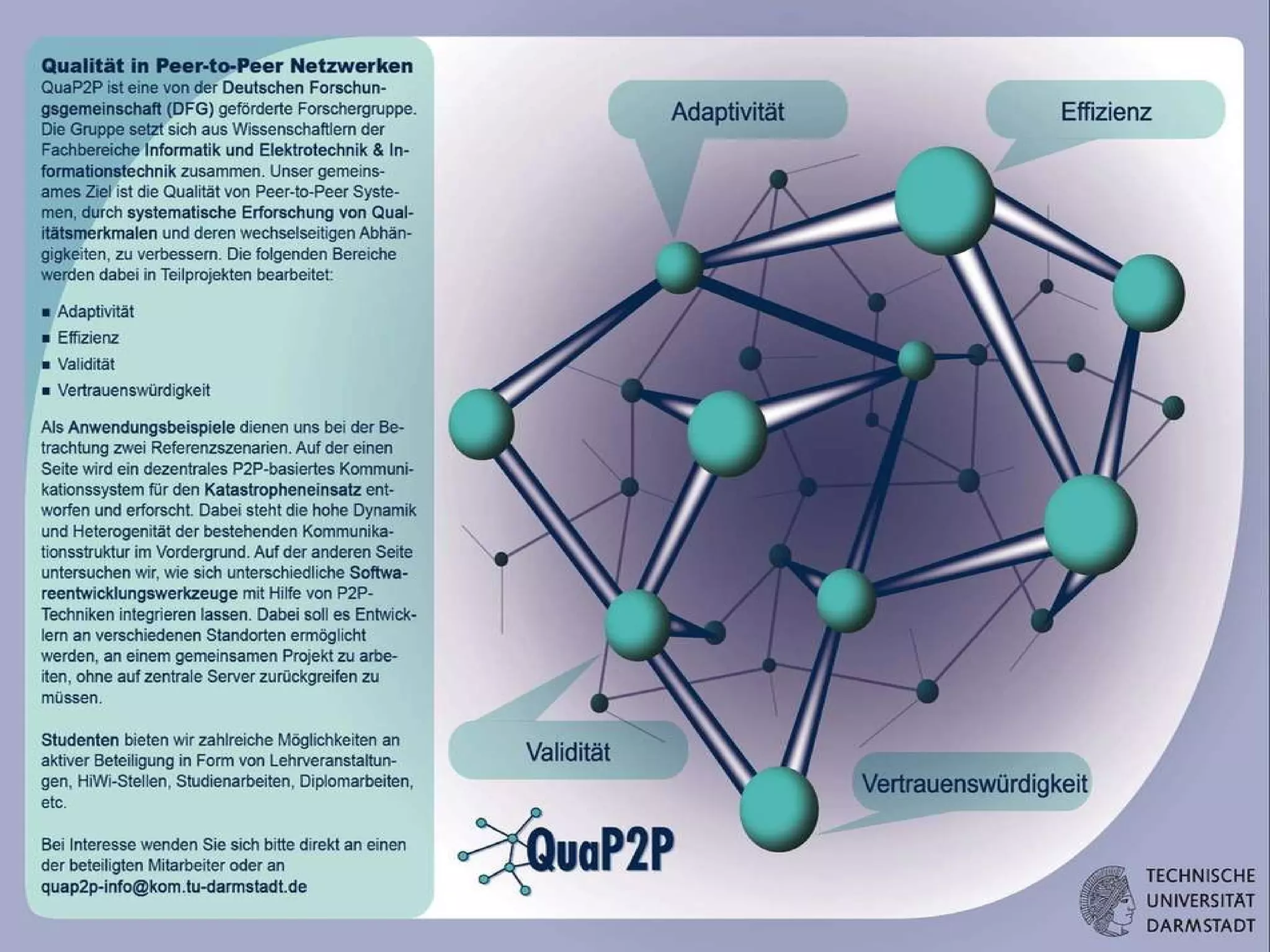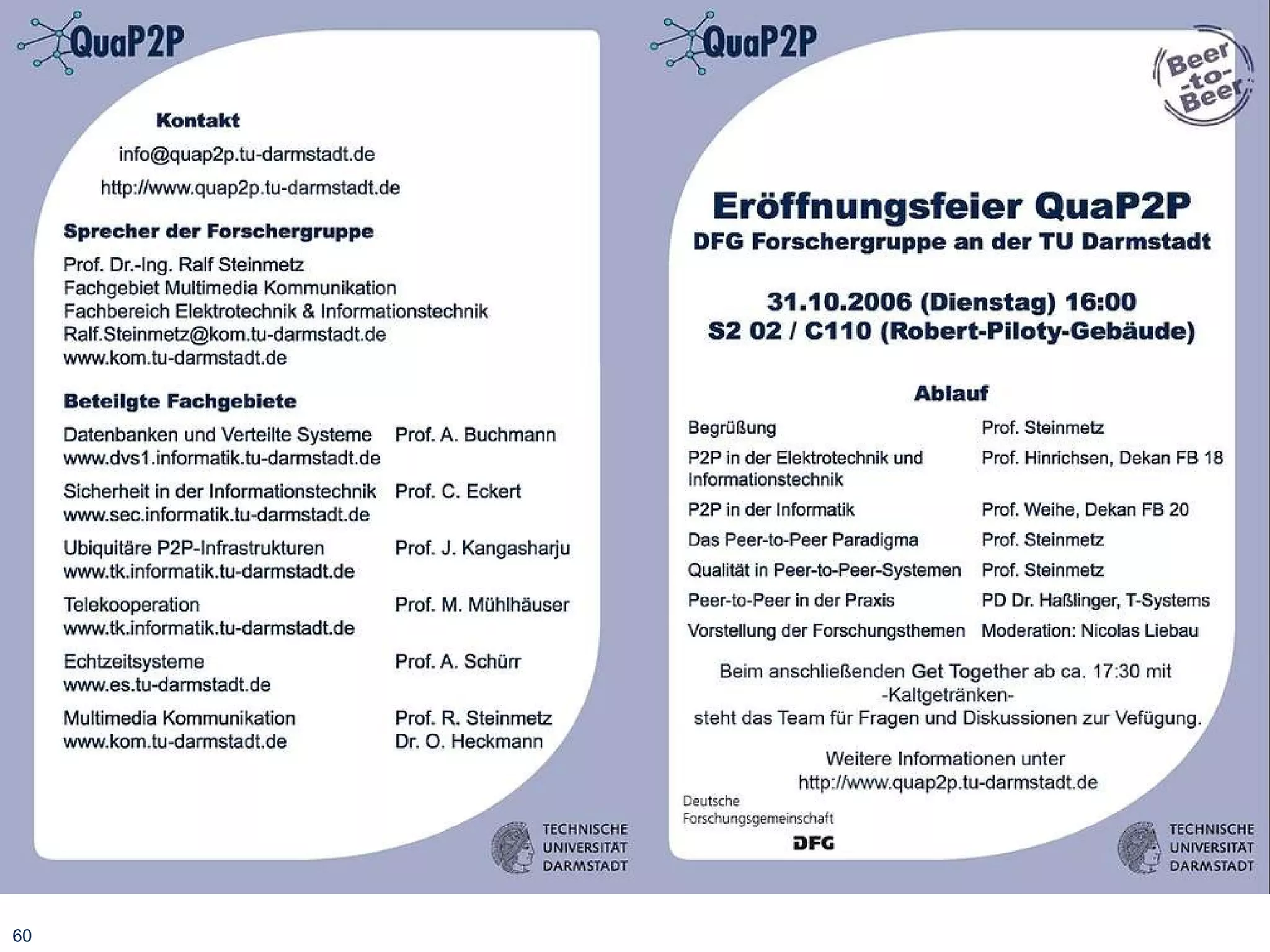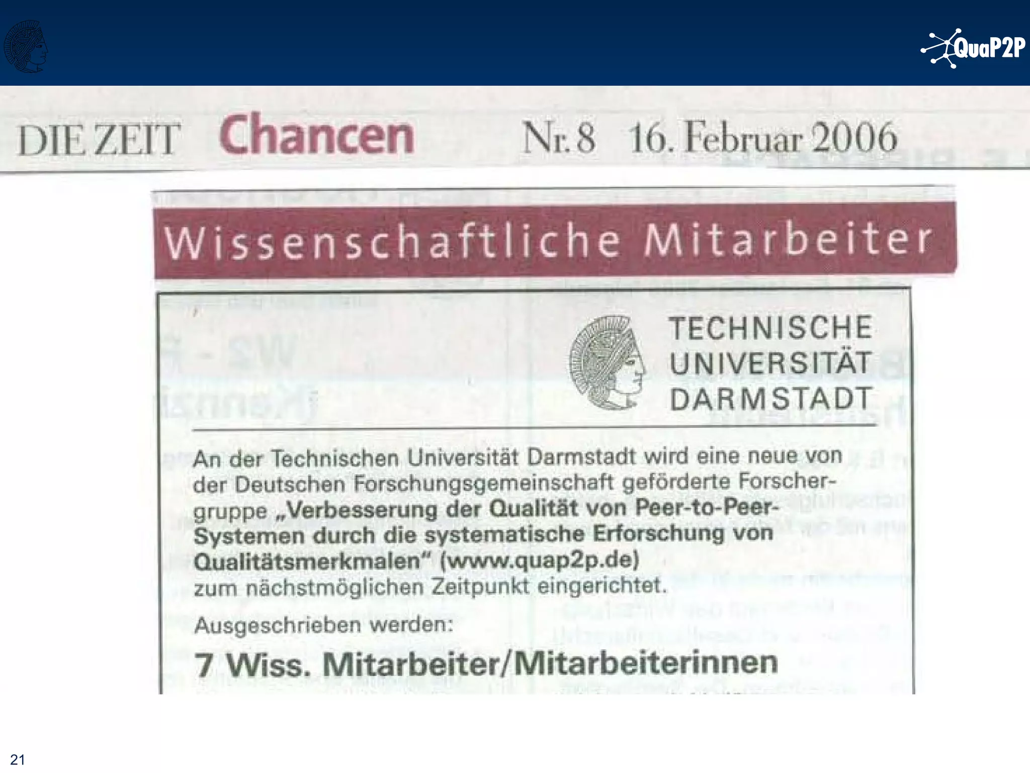 This document summarizes the agenda and goals of a research group meeting on improving the quality of peer-to-peer (P2P) systems. The agenda includes welcome addresses from various deans and professors, presentations on P2P applications and quality in P2P systems. The goals of the research group are introduced, including identifying quality attributes of P2P systems, examining relationships between attributes, and prototyping mechanisms using reference scenarios in disaster recovery communications and software development. Researchers are assigned topics related to performance, costs, security, and other quality attributes.