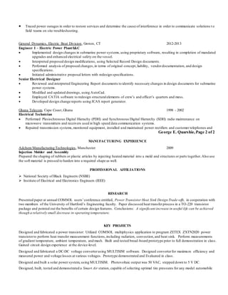 This document is a resume for George E. Quarshie seeking a position as an electrical engineer. He has over 15 years of experience in electrical engineering, power engineering, and operations. His background includes experience in power generation, distribution, controls systems, HVDC transmission, and renewable energy. He is proficient in engineering software such as AutoCAD, COMSOL, Multisim, MatLab, and LabView. His objective is to obtain a position in power engineering, transmission/distribution, or manufacturing.