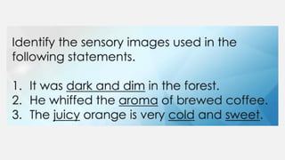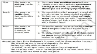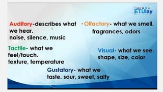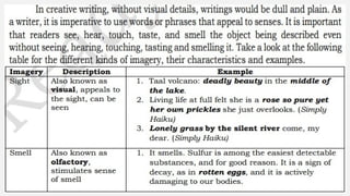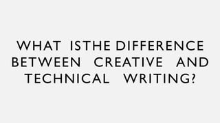 The document discusses the differences between creative and technical writing, highlighting that technical writing is factual while creative writing is imaginative. It also emphasizes the importance of diction and figurative language, including the use of similes to create vivid imagery. Several examples of similes are provided to illustrate their function in enhancing text interpretation and engagement.