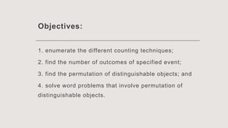 This document discusses permutation of distinguishable objects and provides examples. It introduces the topic with objectives around counting techniques and finding permutations. It then provides examples of counting outfit combinations and menu orderings. The fundamental counting principle is explained as the rule that if one event has m outcomes and a second has n outcomes, the total outcomes of both is m x n.