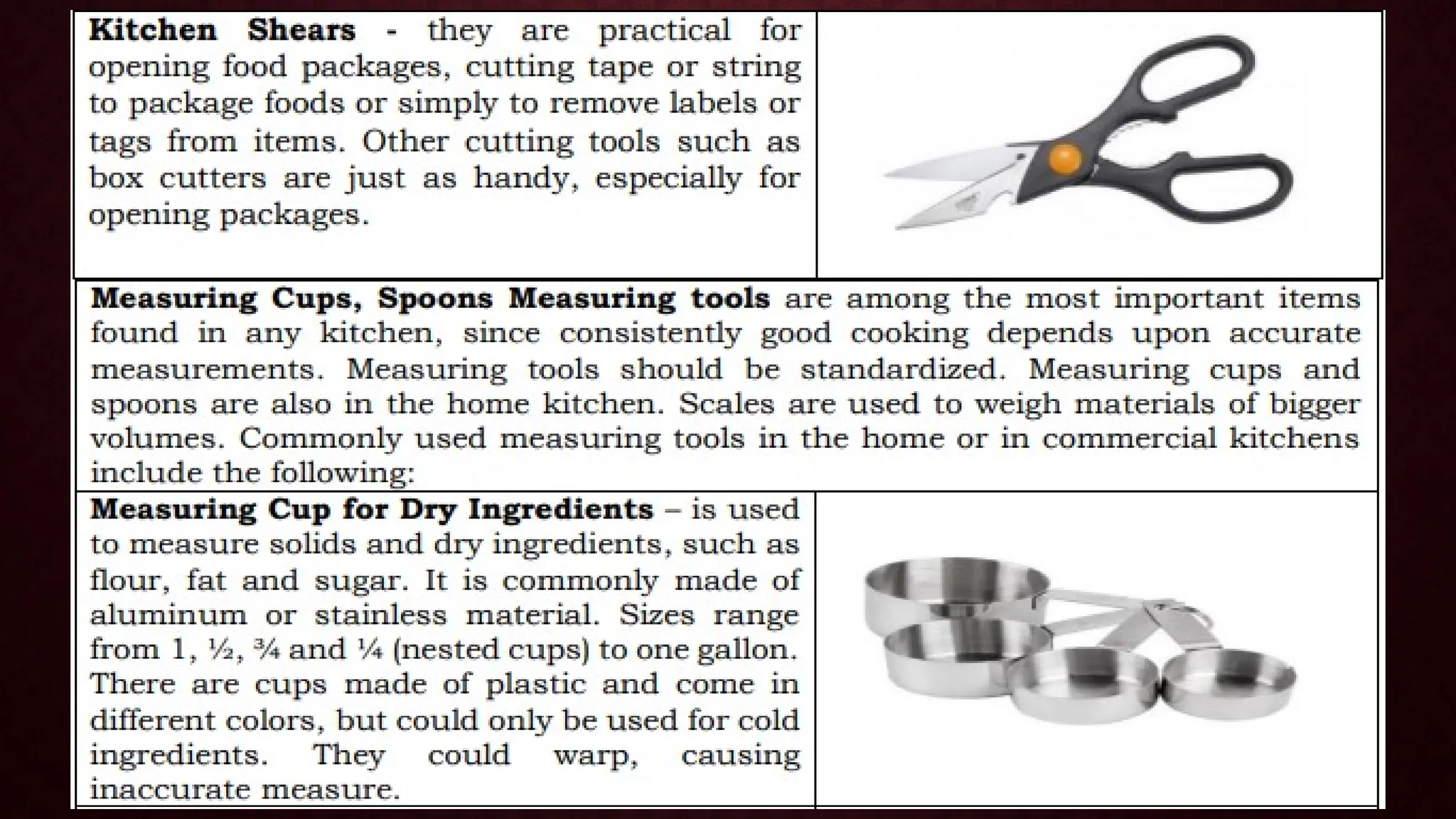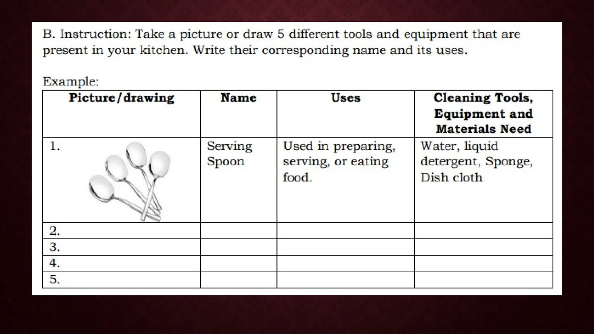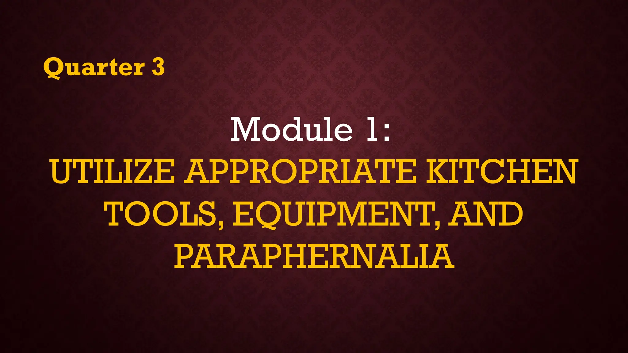 The document is a module for home economics education focusing on the use of kitchen tools, equipment, and cleaning paraphernalia. It covers identification, classification, and the importance of these items for cooking, emphasizing that proper tools can enhance cooking efficiency and meal quality. Additionally, the module includes various exercises and questions to reinforce learning about cooking techniques and safety in the kitchen.