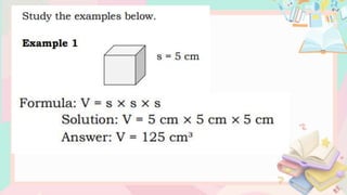 The document consists of a mathematics lesson plan focusing on finding the volume of cubes and rectangular prisms. It includes problem-solving strategies, formulas for volume calculation, unit measurements, and exercises for both routine and non-routine problems. The plan emphasizes understanding volume through practical examples and activities suited for fifth-grade students.