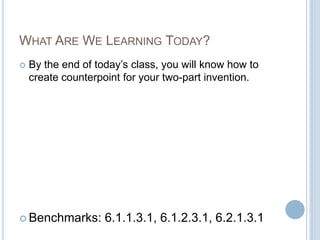 1. The music class agenda includes gathering materials, attendance, learning how to create counterpoint, and work time. 2. Students will learn how to create counterpoint for a two-part invention by emphasizing consonant intervals like thirds, fourths, and fifths and using fewer dissonant intervals. 3. Creating counterpoint involves knowing intervals and using different rhythms between the theme and counterpoint parts, such as half or eighth notes.