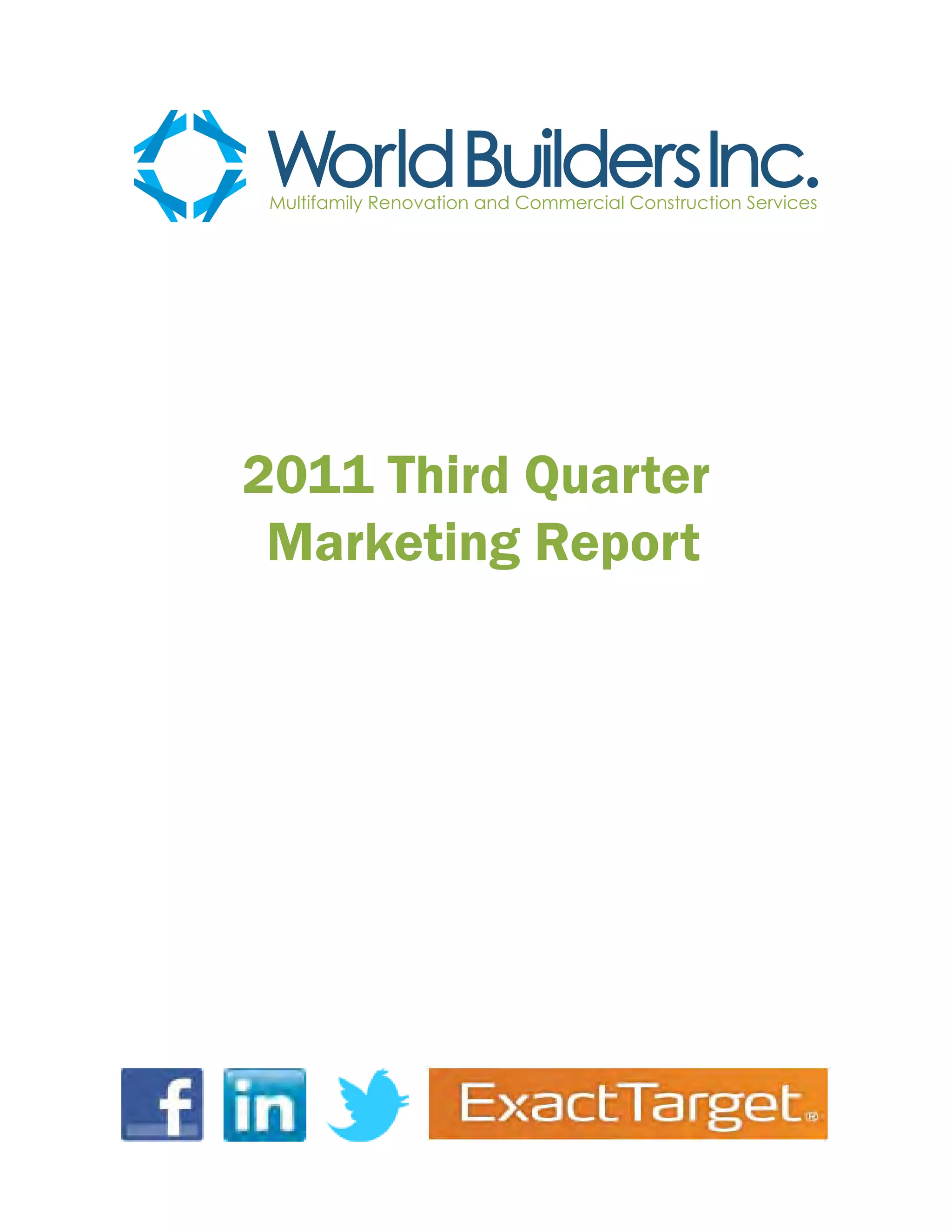 The 2011 third quarter marketing report analyzes the effectiveness of marketing initiatives at World Builders Inc. from June to September 2011, detailing client status, campaign performance, brand interactions, and providing insights for future strategies. Key findings include the acquisition of 9 new clients, notable bid values, and performance metrics from various email campaigns and social media engagements. The report also contains recommendations based on data trends observed during this period.