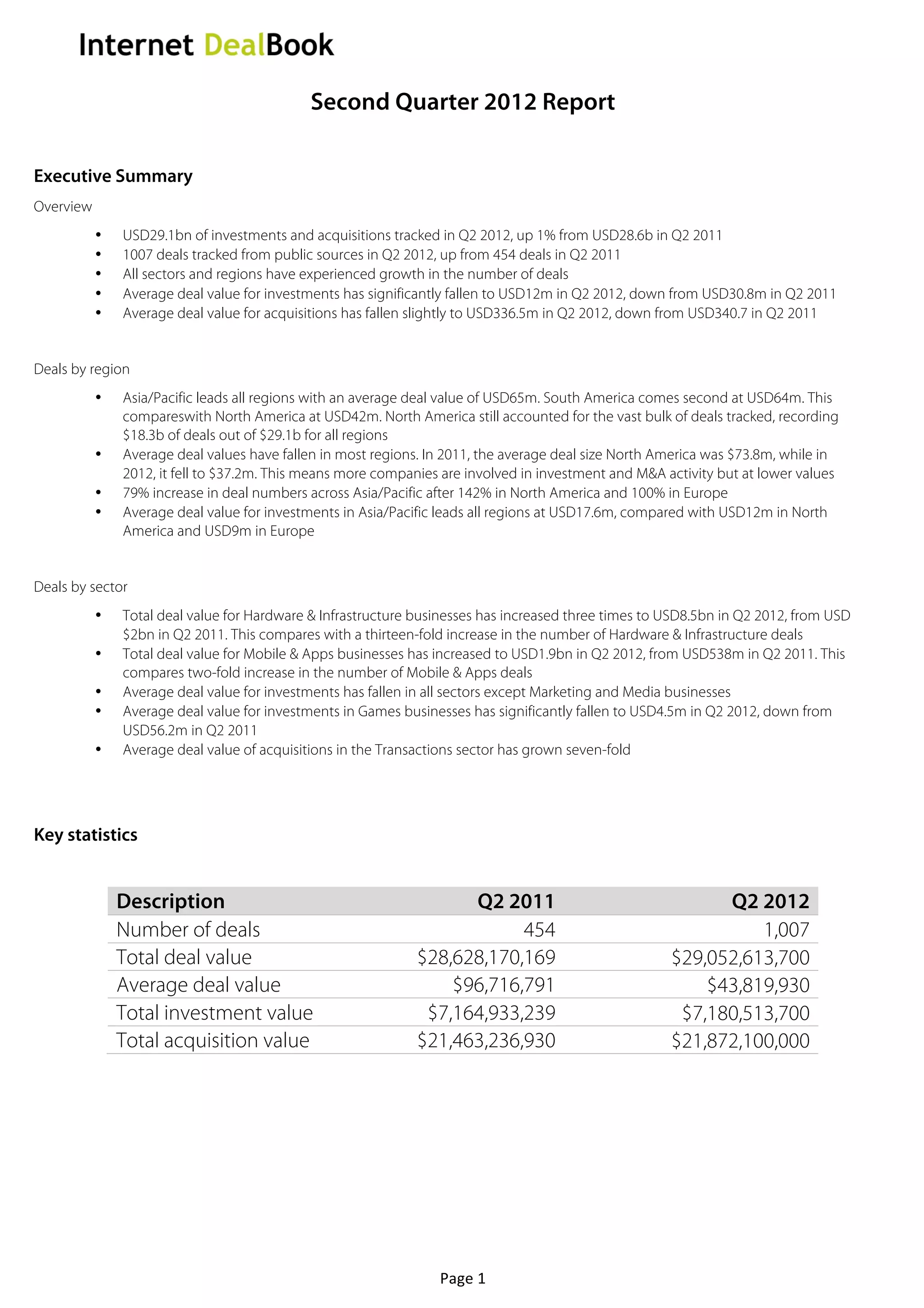 The document summarizes key investment and M&A trends for the second quarter of 2012. It found that while the total deal value and number of deals increased from Q2 2011, the average deal value decreased significantly. The number of deals increased across all regions and sectors. Asia/Pacific and South America had the highest average deal values, while average deal values decreased the most in Europe and North America. Hardware/infrastructure saw the largest increase in total deal value.
