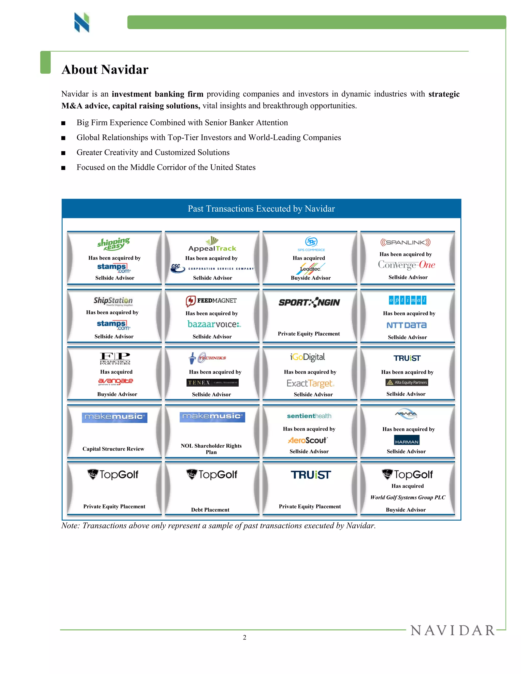 Navidar is an investment banking firm that provides M&A advisory, capital raising, and strategic services to technology and internet companies. The document discusses Navidar's past transactions, industry expertise, and recent market activity in the software and internet sector in Q1 2016. Key points include a mixed performance for different subsectors, an uptick in global M&A deal volume but decline in disclosed deal value, and a sharp drop in US middle market M&A deals. Selected cloud/SaaS transactions are also reviewed.