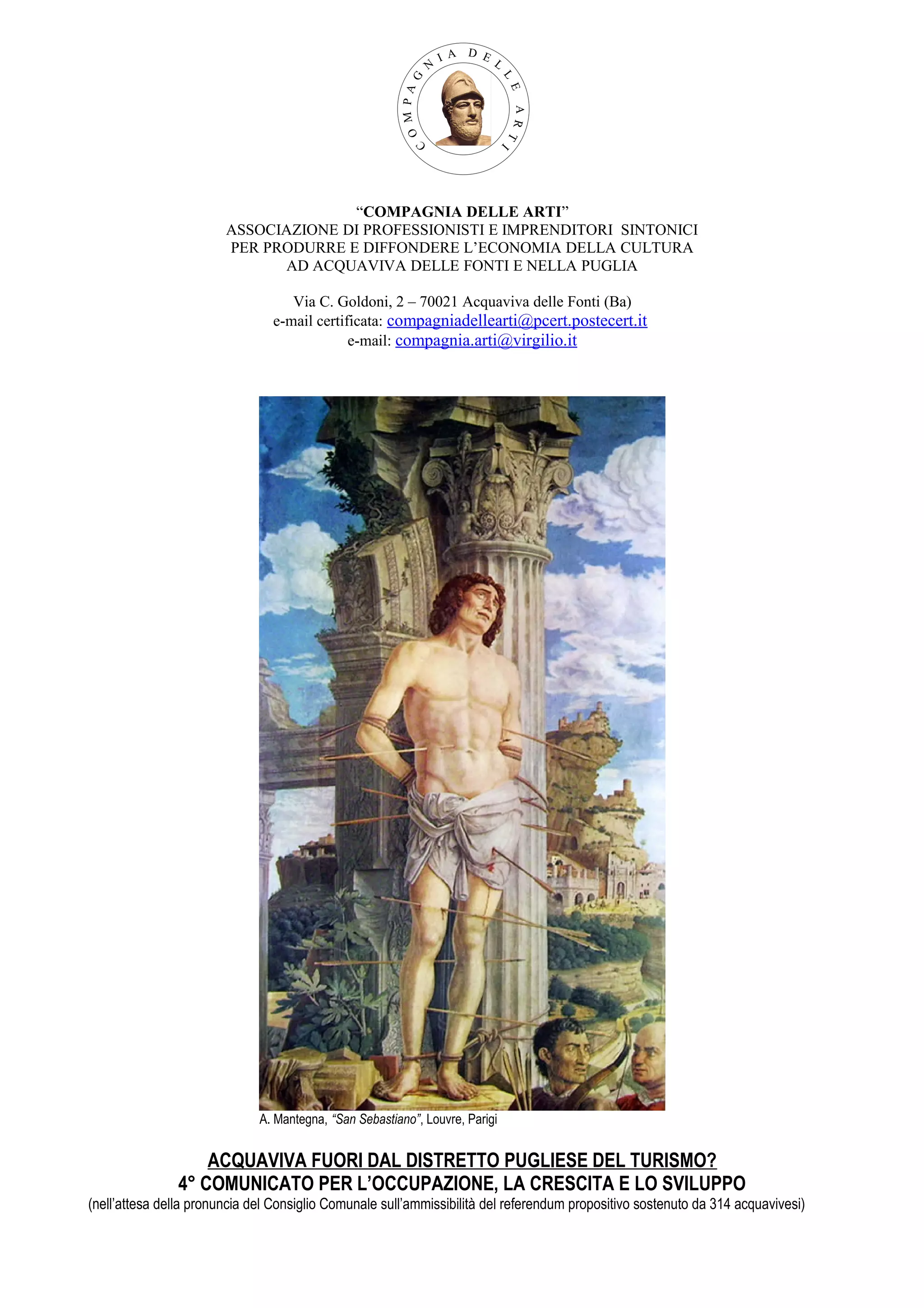 La 'compagnia delle arti' è un'associazione di professionisti e imprenditori dedicata alla promozione dell'economia della cultura ad Acquaviva delle Fonti. Il documento discute le incongruenze e le problematiche legate alla pianificazione urbanistica e alle decisioni dell'amministrazione comunale riguardo alle aree turistico-residenziali e alberghiere, evidenziando come la mancanza di direzione possa compromettere le opportunità di sviluppo economico e turistico. Vengono sollevate interrogativi sulla gestione del territorio e sull'assenza di politiche di sviluppo effettive per il comune.