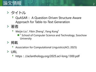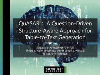表からテキストへの生成は、構造化または半構造化された表形式データから自然言語による説明を自動的に生成することを目的とする。従来のテキスト生成タスクとは異なり、モデルが表構造を正確に理解し表現することが求められる。既存の手法は通常、表を線形化またはグラフ構造に変換して処理する。しかしこれらの手法は、表構造を適切に捉えられないか、複雑な注意機構に依存するため適用範囲が限定される。これらの課題に対処するため、我々はモデルの構造認識・表現能力を強化する質問駆動型自己教師付き学習アプローチ「QuASAR」を提案する。具体的には、自己教師付き学習向けに構造関連クエリ群を構築し、局所的・全体的な表構造の両方を明示的に捕捉するようモデルを誘導する。さらに、生成テキストの流暢性と事実性を向上させるため、2つの補助的事前学習タスクを導入する:単語から文への再構築タスクと数値要約タスクである。ToTToおよびHiTabデータセットでの実験結果は、本手法が既存手法と比較して高品質なテキストを生成することを実証している。