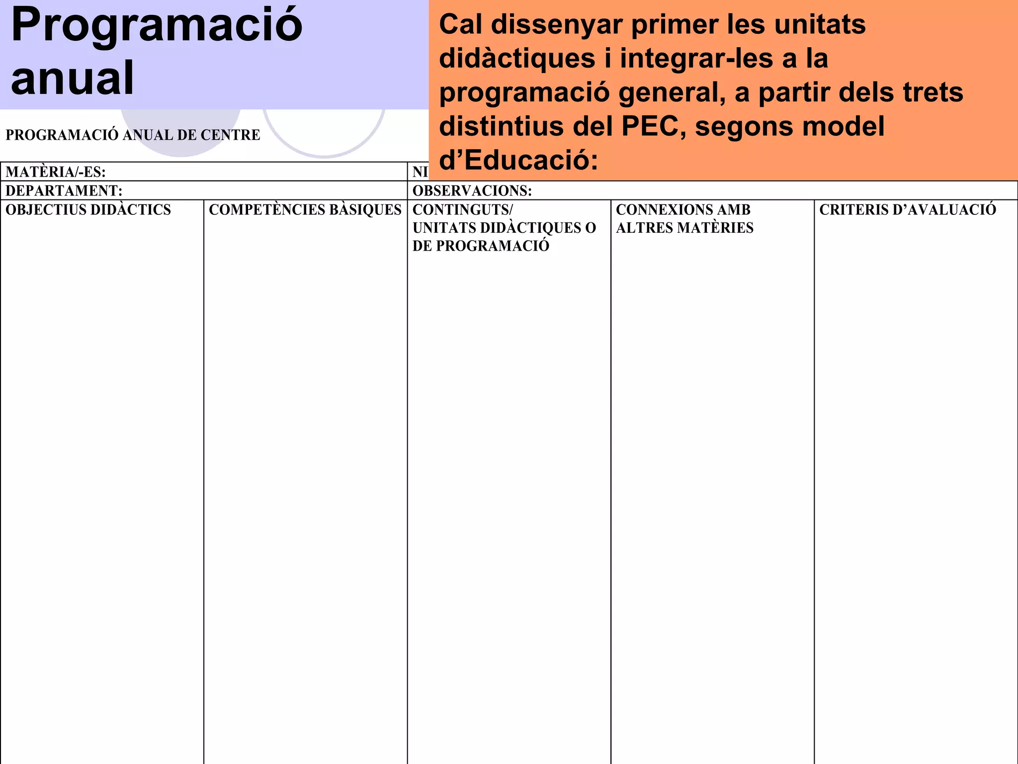 Programació anual Caldissenyar primer les unitats didàctiques i integrar-les a la programació general, a partir dels trets distintius del PEC, segons model d’Educació: