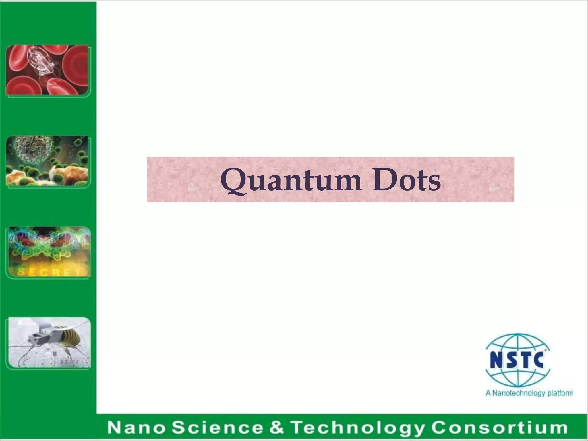 Quantum dots are nanoscale semiconductors that exhibit size- and composition-dependent optical properties. Their small size ranges from 2-10 nanometers in diameter. Quantum dots can be engineered to emit light at specific wavelengths by controlling their size and composition. They are being used for applications such as biomedical imaging, optoelectronics, quantum computing, and solid-state lighting due to properties like bright and resistant fluorescence. Quantum dots can be conjugated to biological molecules like proteins and antibodies for applications as biomarkers.