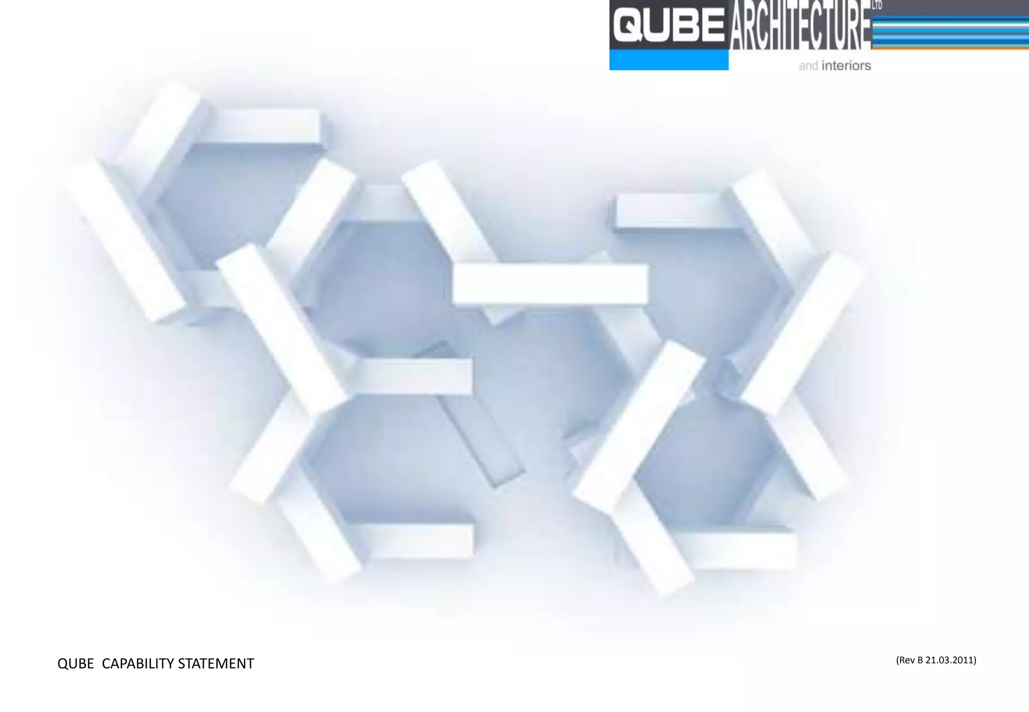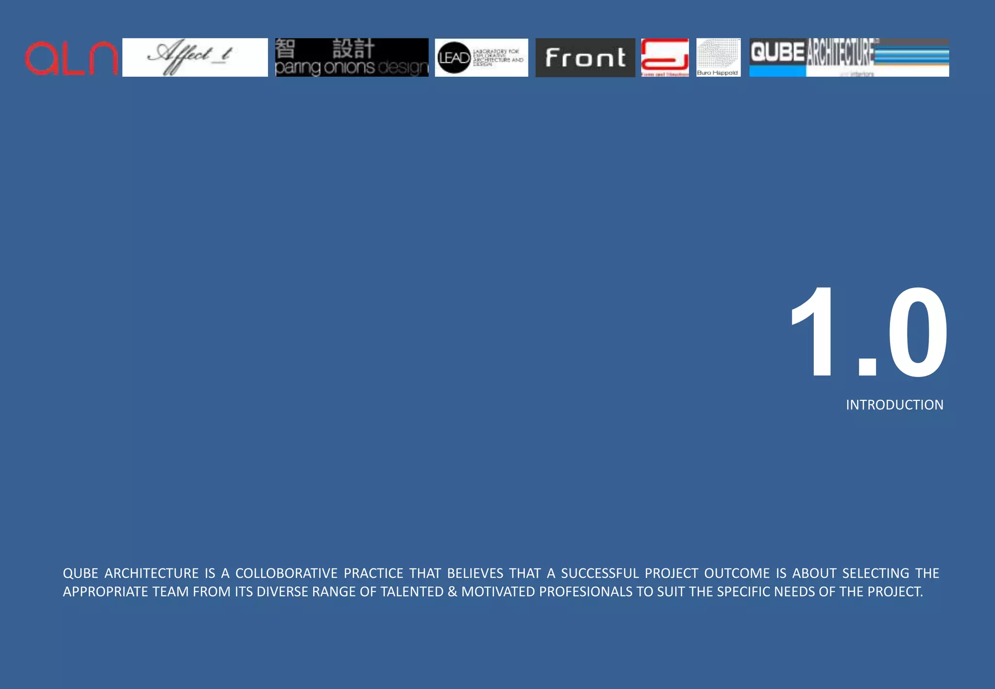 Qube Architecture is an international design studio with offices in Hong Kong and New Zealand. It believes in a collaborative approach to design and gathers a diverse team of talented professionals for each project. The core team includes experts in design, technology, sustainability, facades, and landscaping. Qube aims to produce sustainable, cost-effective designs through a bottom-up process that considers client needs and the project brief. It uses advanced technology like BIM and form-finding software to support the design process and maximize efficiency.