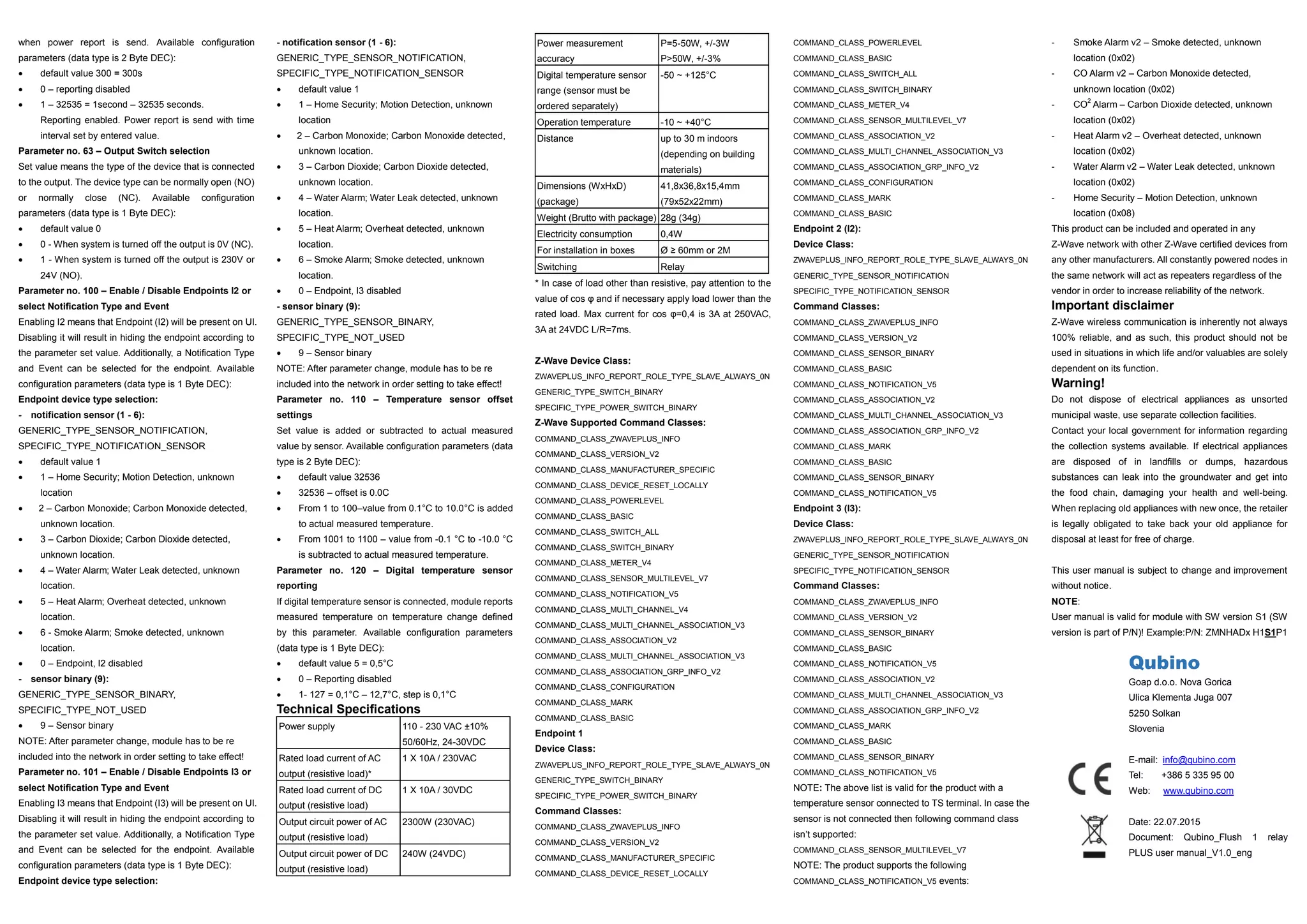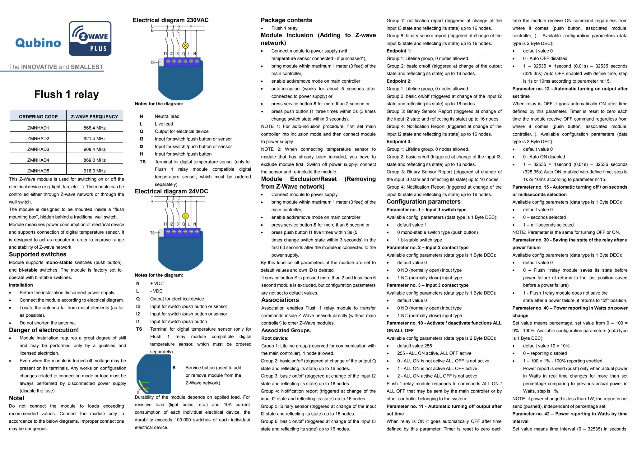This document provides information about the Qubino Flush 1 relay Z-Wave module. The module can be used to switch electrical devices on or off through the Z-Wave network or a wall switch. It supports connection to a digital temperature sensor and can act as a repeater to improve the Z-Wave network range. The module measures power consumption and supports mono-stable and bi-stable switches. It provides information on inclusion into a Z-Wave network and configuration parameters for functions like power reporting and input settings.