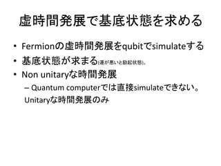 初期波動関数を用意し、虚時間発展をさせると厳密な基底状態に落ちることはよく知られている。それを量子コンピュータで行う方法を提案した。虚時間発展はユニタリ的ではないため通常の虚時間発展ではなく、時間依存変分法を解いてフィッティングを行っている。LiH / STO-3G 4軌道 6qubitの系で試して厳密解を非常に効率よく再現した。