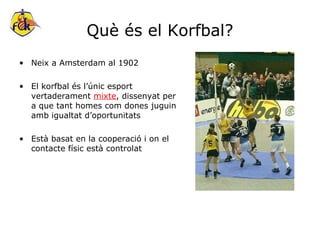 Què és elKorfbal? Neix a Amsterdam al 1902 El korfbal és l’únic esport vertaderament mixte , dissenyat per a que tant homes com dones juguin amb igualtat d’oportunitats Està basat en la cooperació i on el contacte físic està controlat