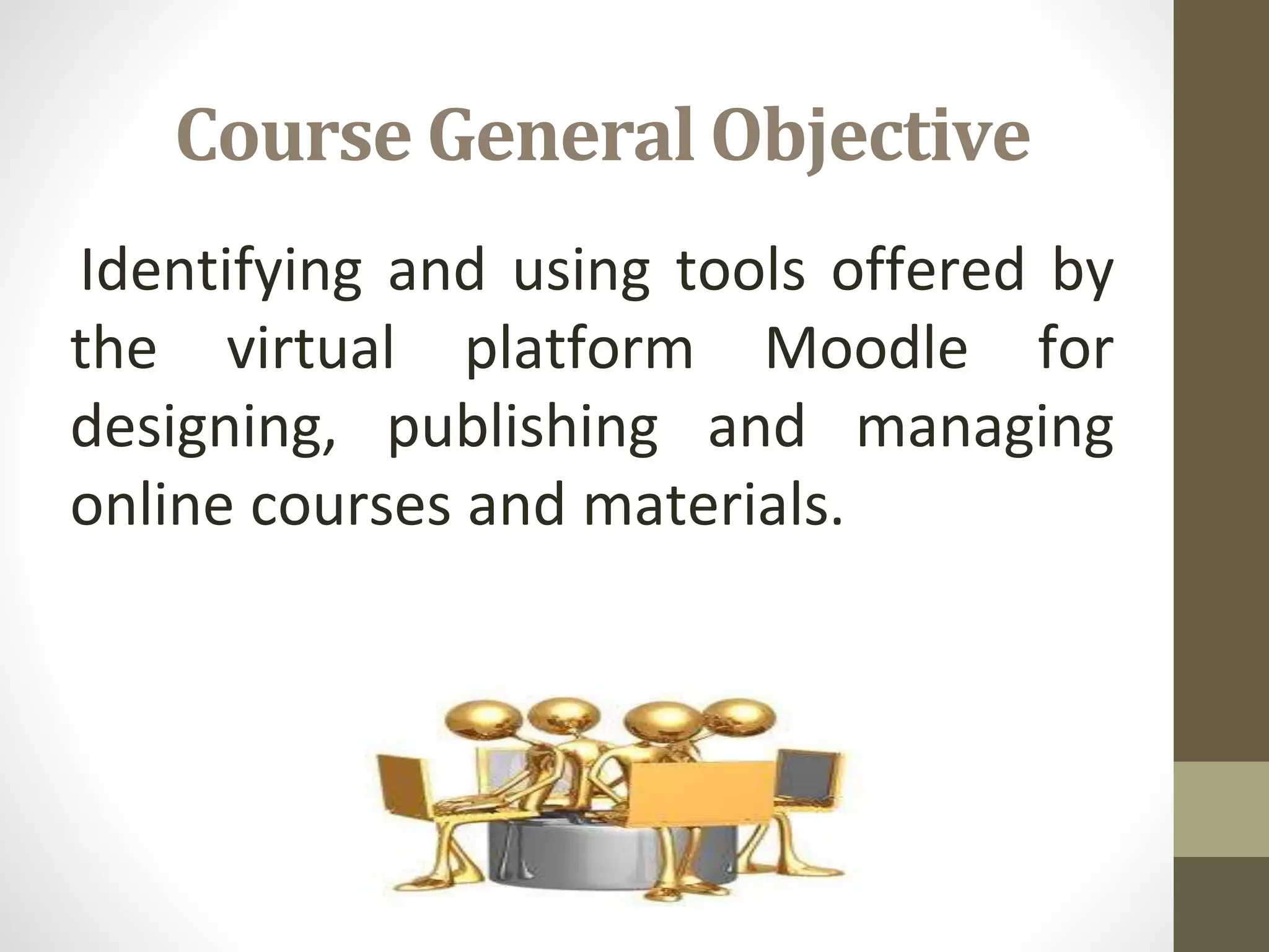 Moodle is a free and open-source learning management system that allows teachers to create online courses and manage course materials. The document outlines a basic Moodle course for teachers that will meet for 5 two-hour sessions and require 10 additional hours of independent work. It describes what Moodle is, its origins, strengths, tools, and widespread use with over 50,000 websites hosting courses in over 100 languages worldwide.