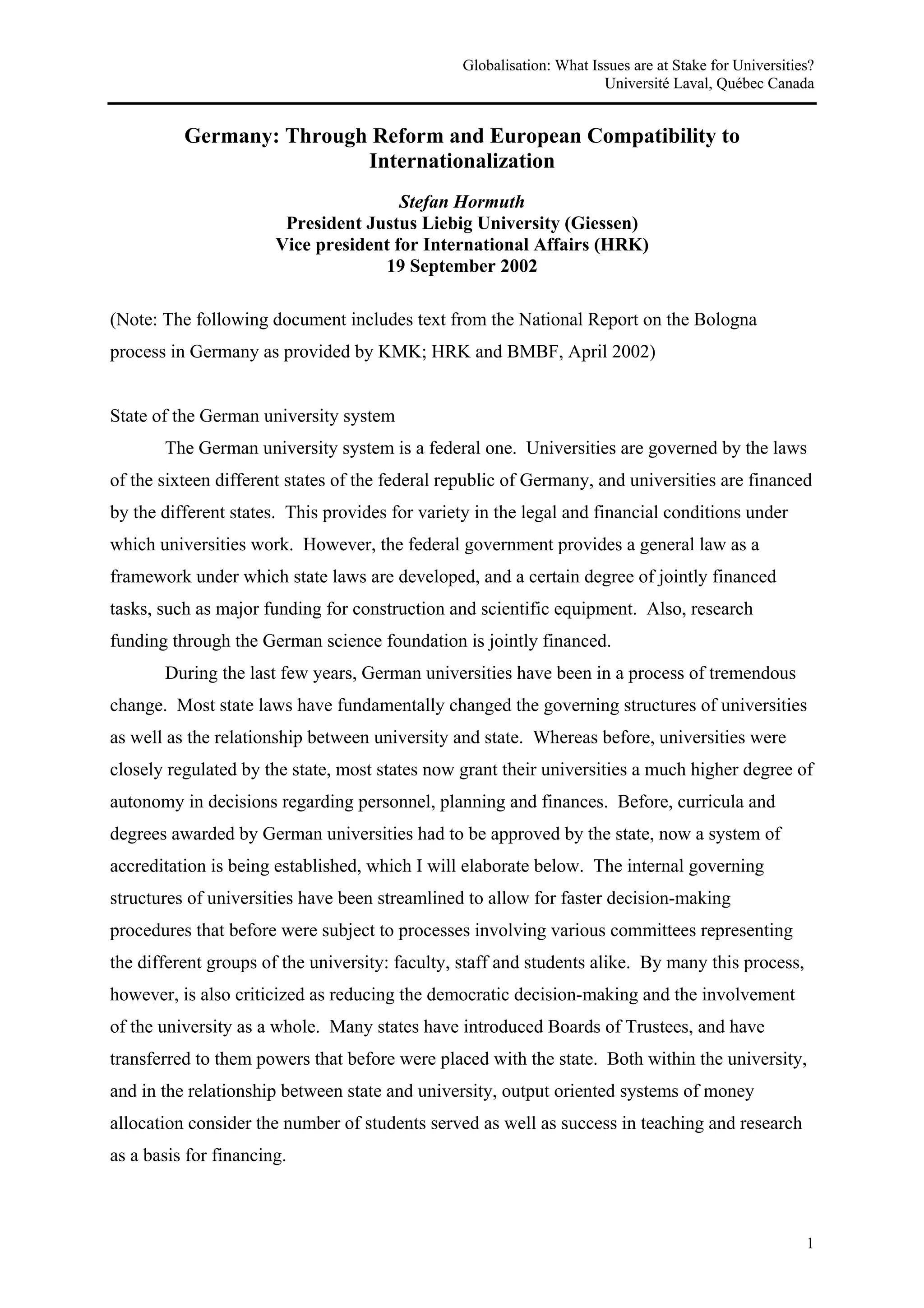 1) Germany is reforming its university system to introduce Bachelor's and Master's degrees in line with the Bologna Process to standardize higher education degrees across Europe and promote student mobility.