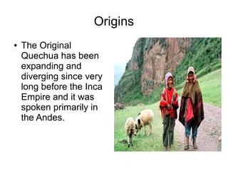 Quechua has been spoken in the Andes region of South America for a long time, even before the Inca Empire. After the Spanish conquest in the 16th century, Quechua continued to be used widely to communicate between the Spanish and indigenous peoples. However, over time its prestige declined and it became restricted to rural areas. Now there are approximately 6,500 native Quechua speakers worldwide, located primarily in Peru. The language is endangered because some believe Spanish signifies education and culture, while Quechua is seen as a language for uneducated people.
