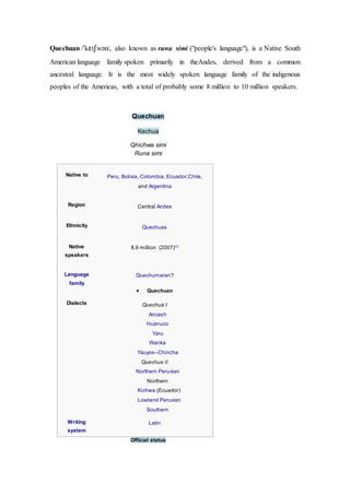 - Quechua is a Native South American language family spoken primarily in the Andes by approximately 8-10 million people.