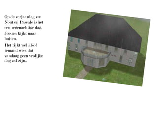 Op de verjaardagvan Nout en Pascale is het een regenachtige dag.Jessica kijkt naar buiten.Het lijkt wel alsof iemand weet dat vandaag geen vrolijke dag zal zijn..
