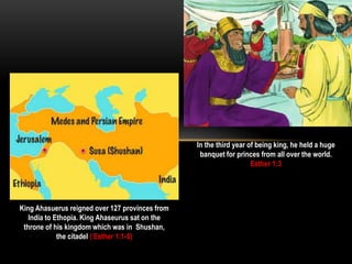 King Ahasuerus ruled over 127 provinces from India to Ethiopia with his capital in Shushan. He held a banquet for princes from all over the world, but his wife Queen Vashti refused the King's order to appear before the guests. In response, the King removed Vashti as queen and held a beauty contest to select a new queen, choosing Esther. Esther's cousin Mordecai overheard a plot to kill the king and informed Queen Esther, leading to the conspirators' execution. Later, Haman was promoted and enacted a plan to kill all Jews, including Mordecai and Esther, but their efforts resulted in Haman's downfall and the Jews