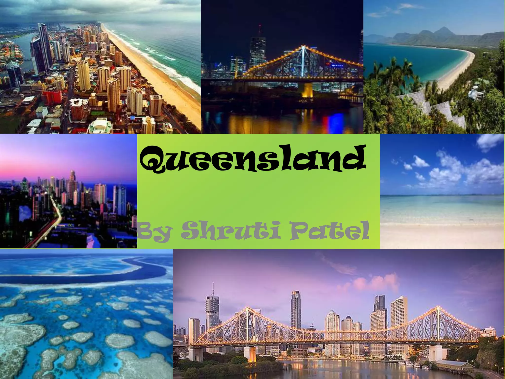 Queensland has several major cities including Brisbane, the Gold Coast, Cairns, the Sunshine Coast, and Townsville. The document then lists famous landmarks in some of Queensland's cities such as the Story Bridge and Brisbane River in Brisbane and the Surf World on the Gold Coast.