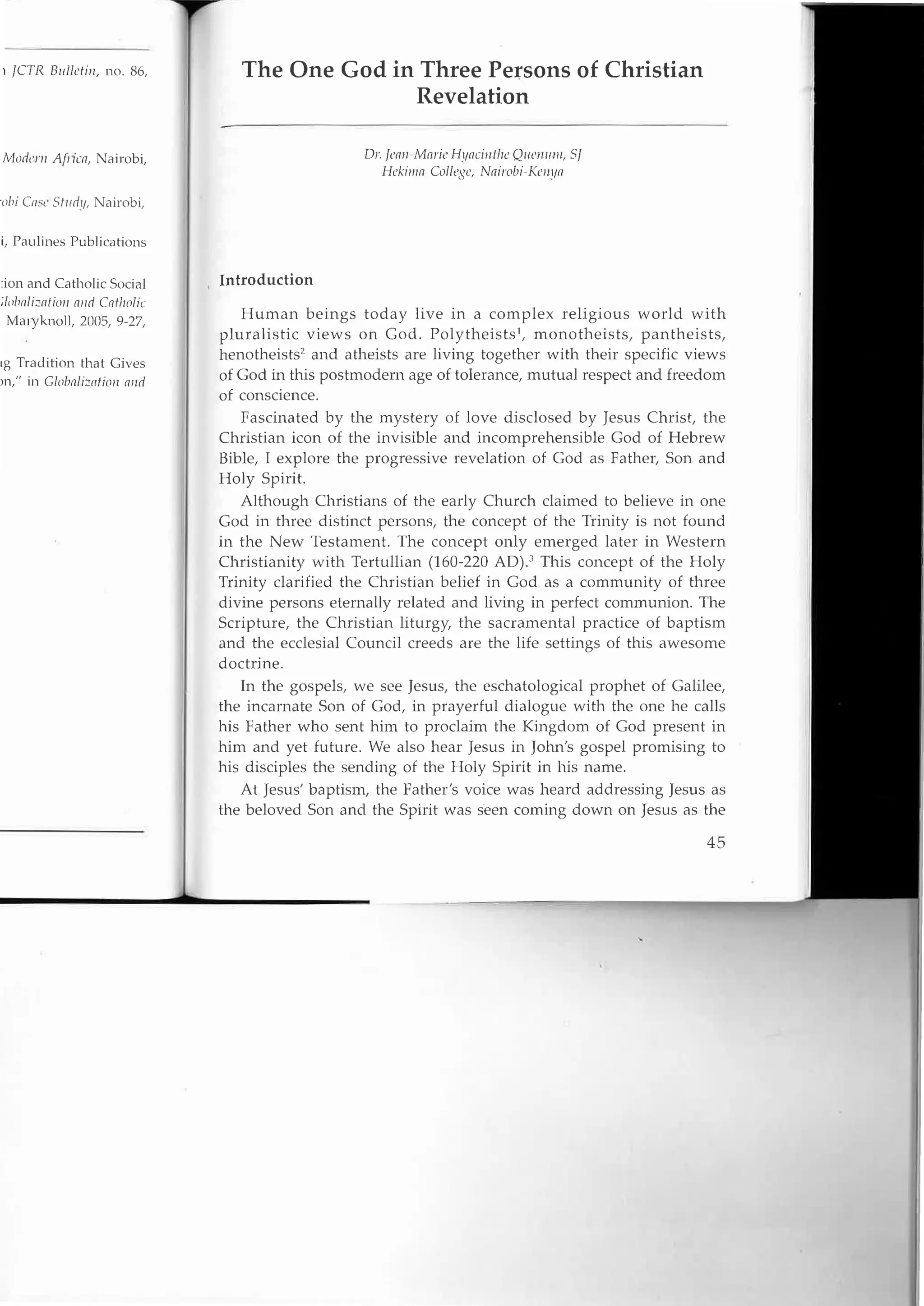 This document provides an overview of the Christian doctrine of the Trinity. It begins by noting that while the concept of God as one being in three persons is not explicitly found in the New Testament, it emerged in the early Church. The document then examines passages from the gospels that point to Jesus, the Holy Spirit, and God as distinct persons. It discusses how baptism in the early Church involved confession of faith in God as Father, Son and Holy Spirit. The Trinity is presented as the central mystery of the Christian faith, with each person of the Trinity revealed through their distinct roles in creation and redemption. The early Church is described as experiencing the inner divine life of love from the Father, Son, and Holy Spirit, and