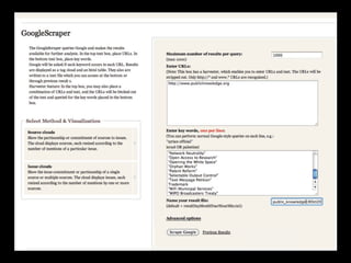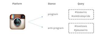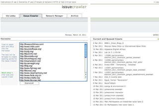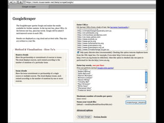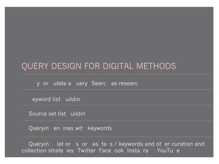 Prof. Dr. Richard Rogers discusses query design for digital methods research. He outlines building keyword lists and source sets to query search engines and social media platforms. Some techniques include associative query snowballing on Google to iteratively expand keyword lists, excluding sites from queries, and using hashtags or user mentions to collect tweets about an issue. The goal is to study how programs, counter-programs and neutral stances are discussed online.