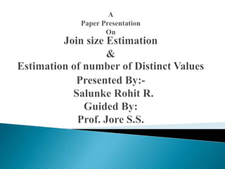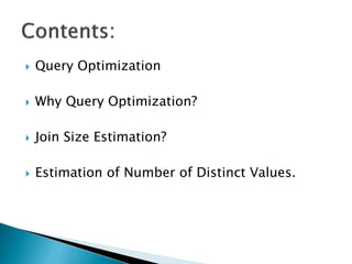 The document discusses query optimization in databases. Query optimization is the process of selecting the most efficient query evaluation plan to minimize costs and maximize performance. An optimized query will be executed faster using less system resources. Key factors considered during optimization include join size estimation, estimating the number of distinct values, and catalog information about relations.