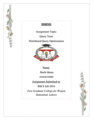 The document discusses query trees in the context of distributed query optimization, explaining their structure and the conversion from parse trees to logical query trees. It outlines various approaches to query optimization, including dynamic, static, semijoin-based, and hybrid methods, emphasizing the trade-offs between communication time and response time. Additionally, it covers the challenges presented by nested queries and the complexities involved in processing correlated subqueries.