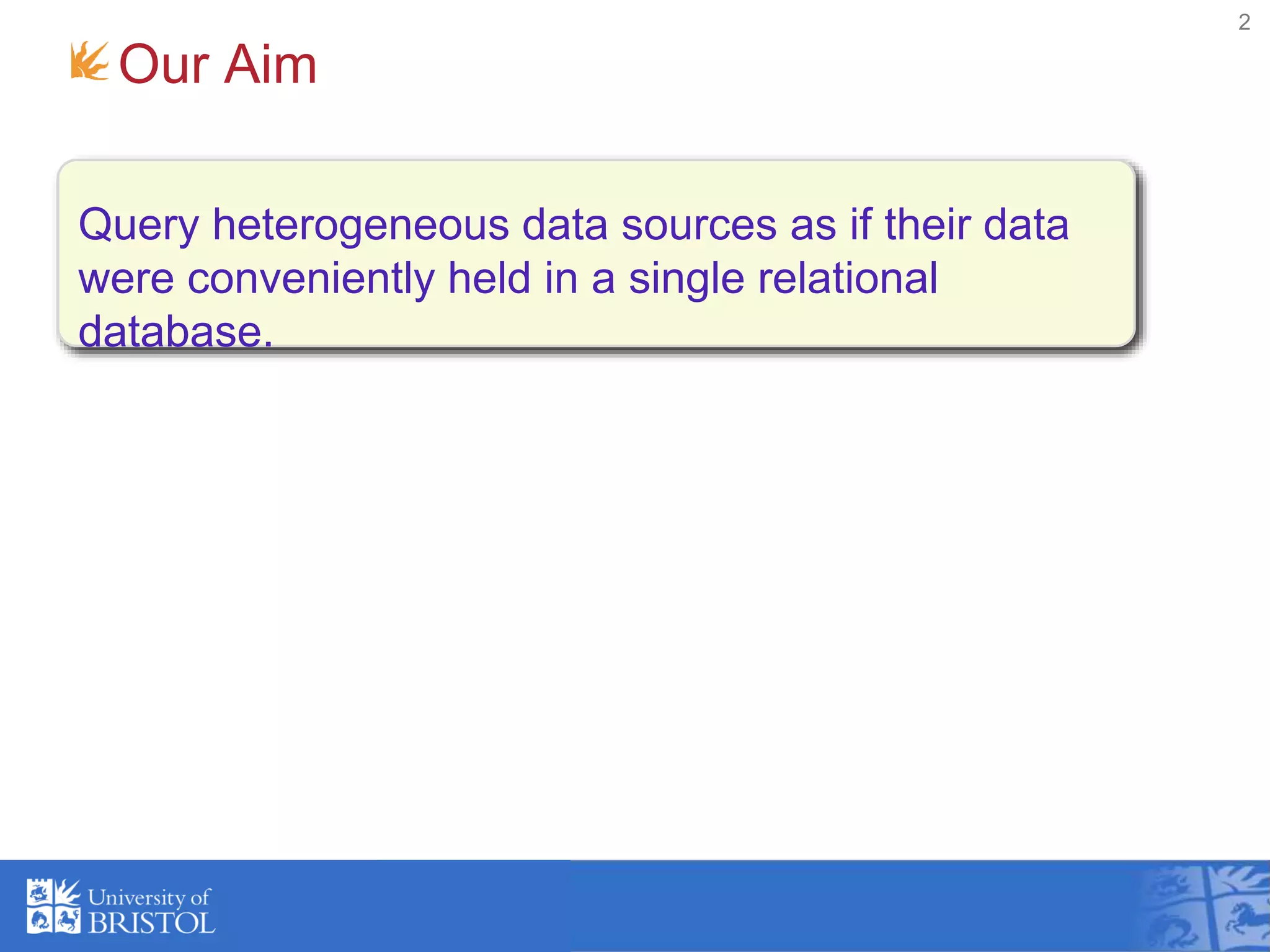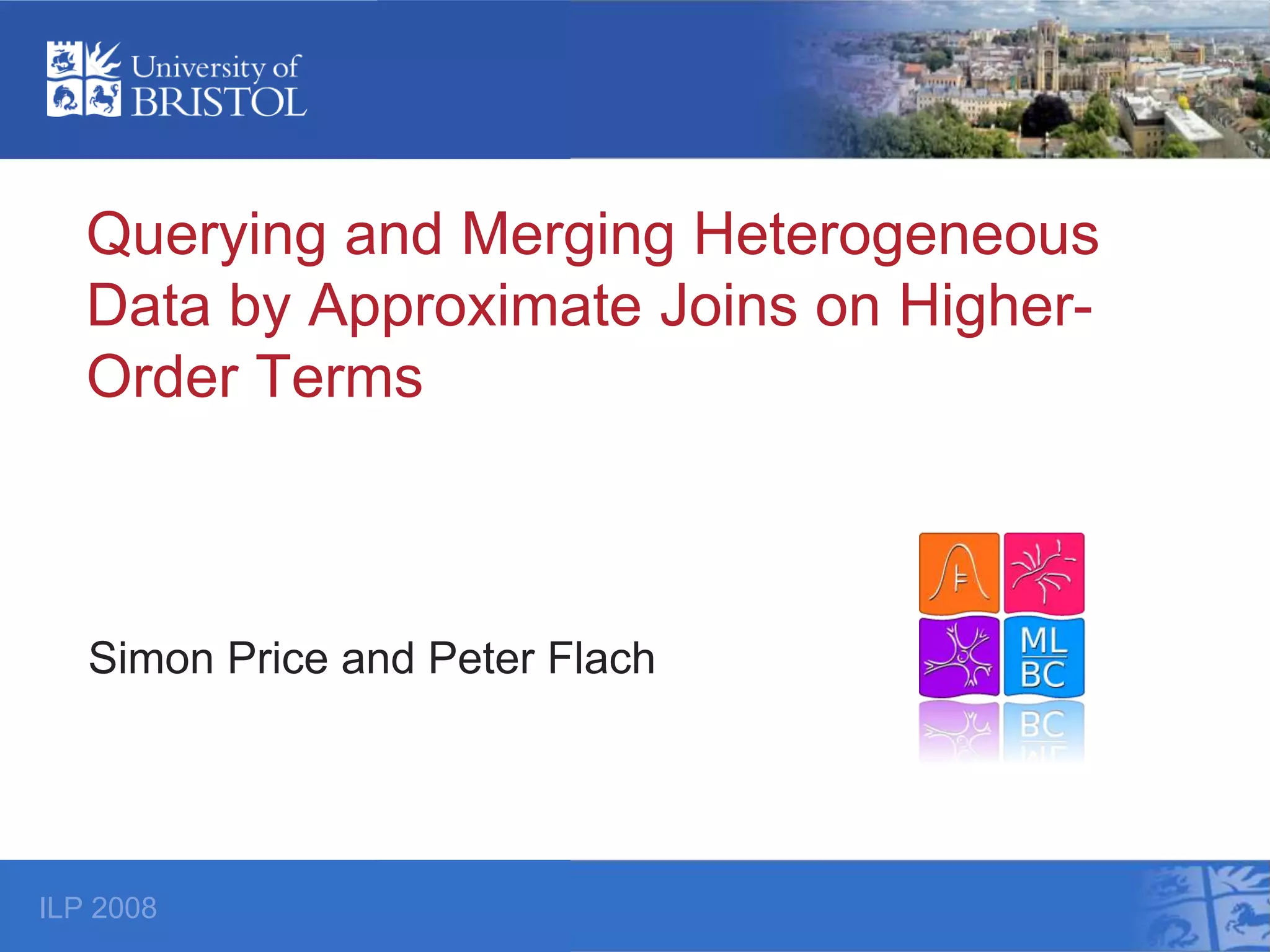 The document discusses querying and merging heterogeneous data using approximate joins based on higher-order terms, specifically addressing the integration of varied data sources like web pages and databases. It outlines a framework for relational joins tailored for basic terms, introduces basic term proximity-joins, and demonstrates its application in bibliographic data. The work presents a novel relational algebra that facilitates approximate querying and highlights its implications for data integration.