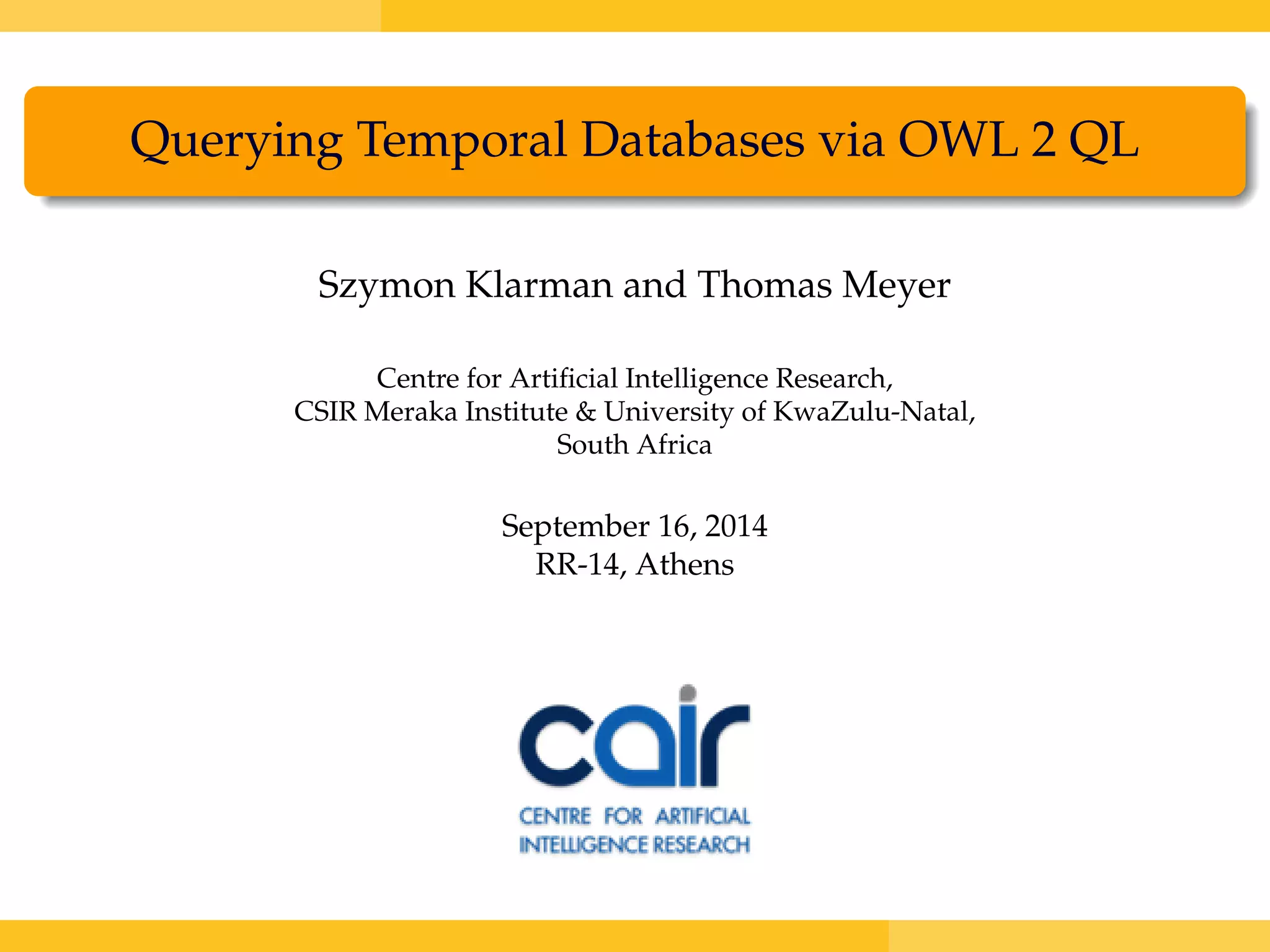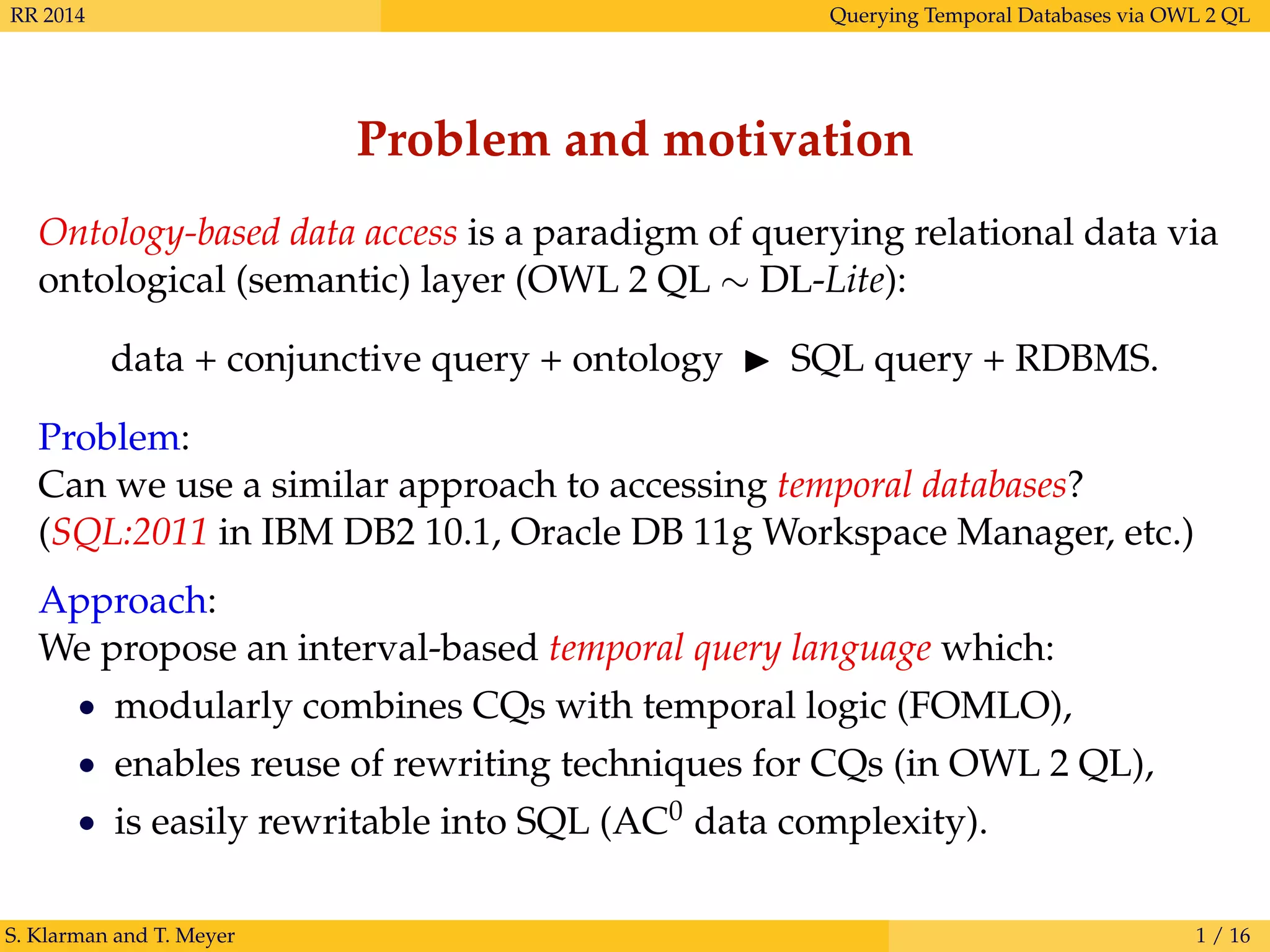 The document discusses querying temporal databases using an interval-based query language combining conjunctive queries with temporal logic in the context of ontology-based data access. This approach aims to enhance the capabilities of querying relational databases by enabling access to temporal data similar to how OWL 2 QL operates on static data. The authors propose techniques for rewriting temporal queries into SQL while addressing key challenges such as temporal joins and coalescing overlapping intervals.